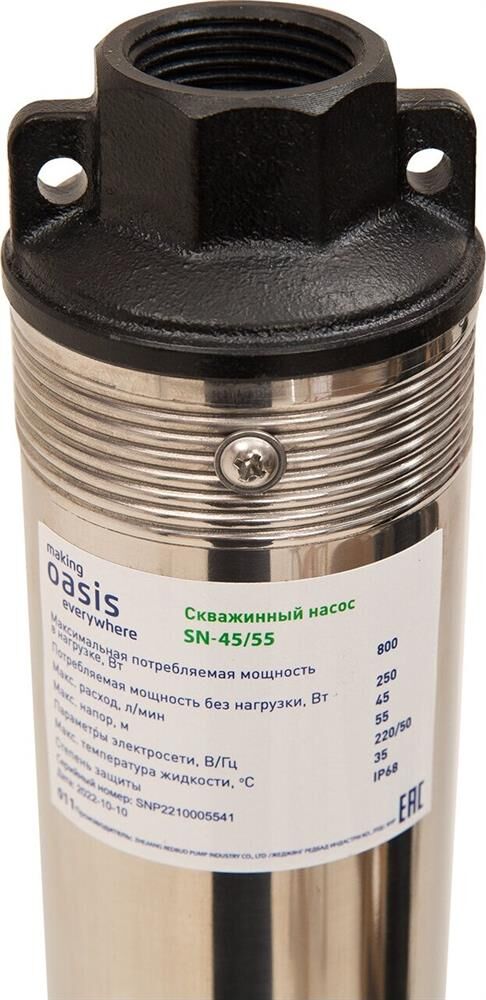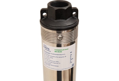 Насос скважинный OASIS, Медная обмотка двигателя, Мощность - 800 Вт, Диаметр корпуса - 3", Производительность - 45 л/мин, Максимальный напор - 55 м, Макс. глубина погружения 70 м, Макс. допускаемая концентрация твердых частиц в воде - 100 г/м3, Макс. размер пропускаемых частиц - 1,5-2 мм, Количество импеллеров -14, Длина шнура - 30 м.