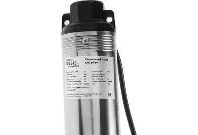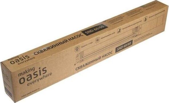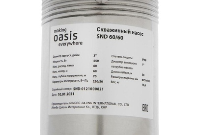 Насос скважинный OASIS, Медная обмотка двигателя, Мощность - 900 Вт, Диаметр корпуса - 3", Производительность - 60 л/мин, Максимальный напор - 60 м, Макс. глубина погружения 70 м, Макс. допускаемая концентрация твердых частиц в воде - 100 г/м3, Макс. размер пропускаемых частиц - 1,5-2 мм, Количество импеллеров - 17, Длина шнура - 30 м.