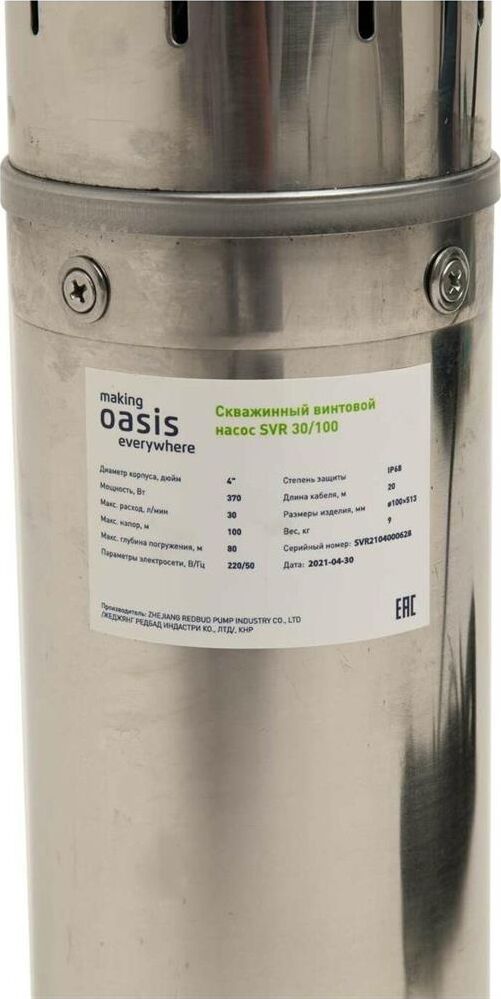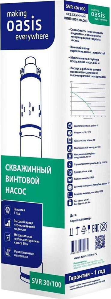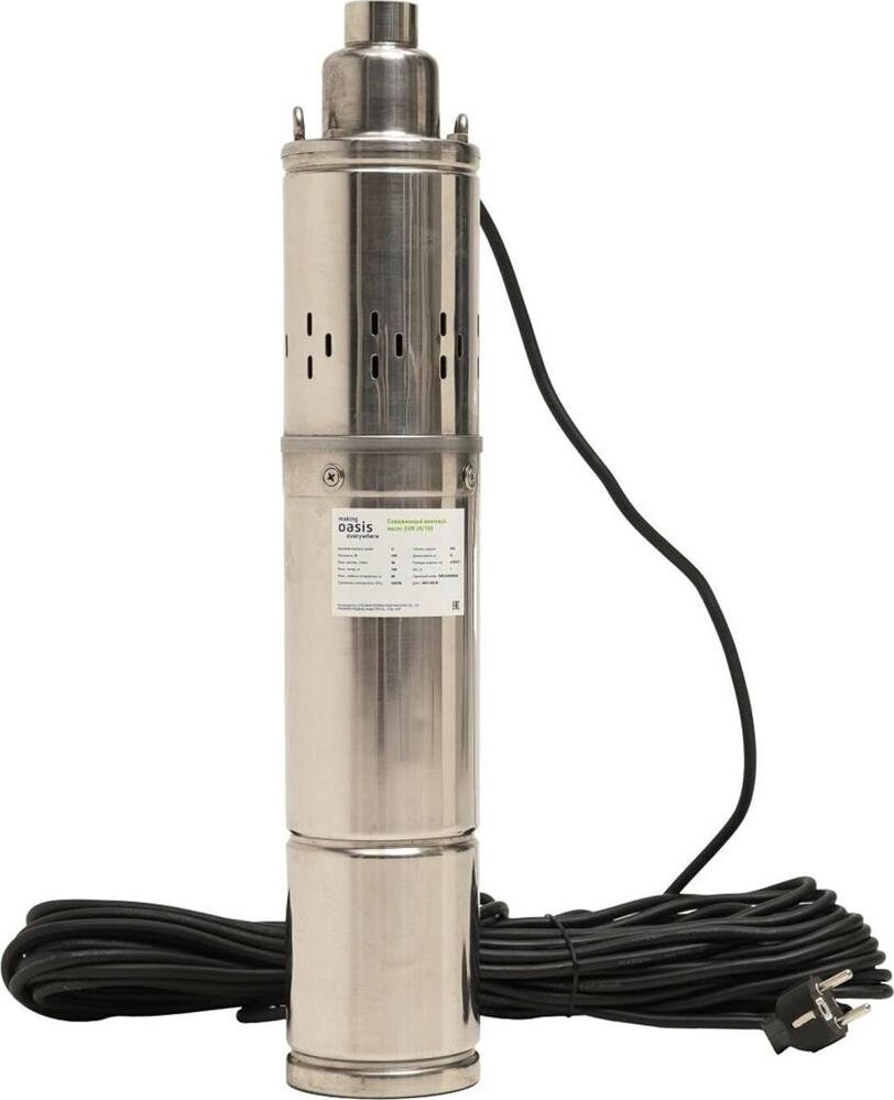 Мощность, Вт 370. Макс. расход, л/мин 30. Макс. напор, м 100. Макс. глубина погружения, м 80. Макс. допускаемая концентрация твердых частиц в воде, г/м3 300. Макс. размер пропускаемых частиц, мм 0,5. Материал корпуса Нержавеющая сталь. Тип двигателя Маслозаполненный двигатель. Длина кабеля 20. Диаметр изделия, мм 96.