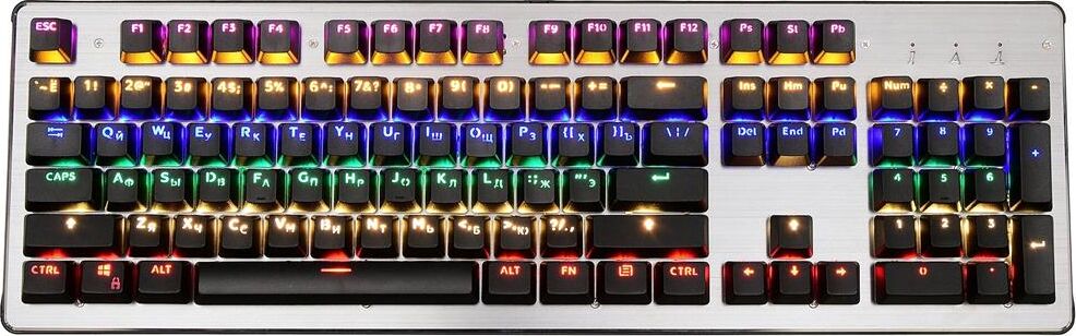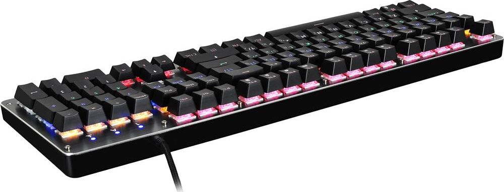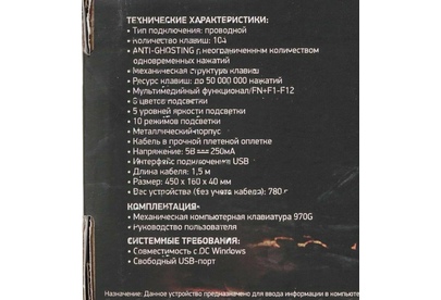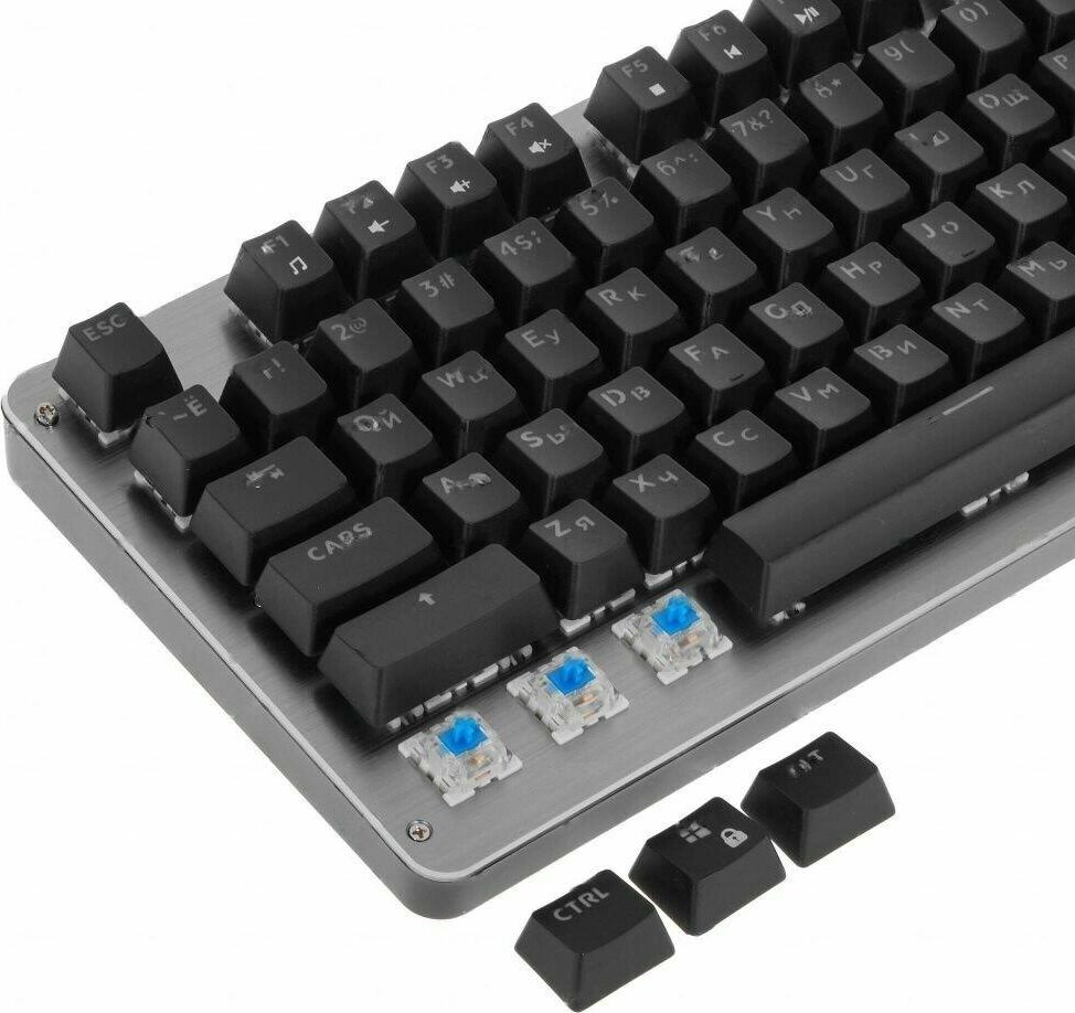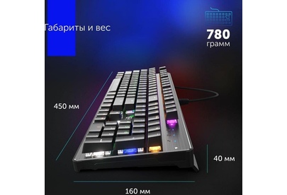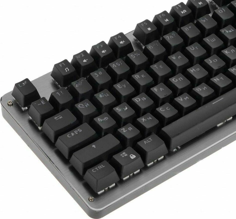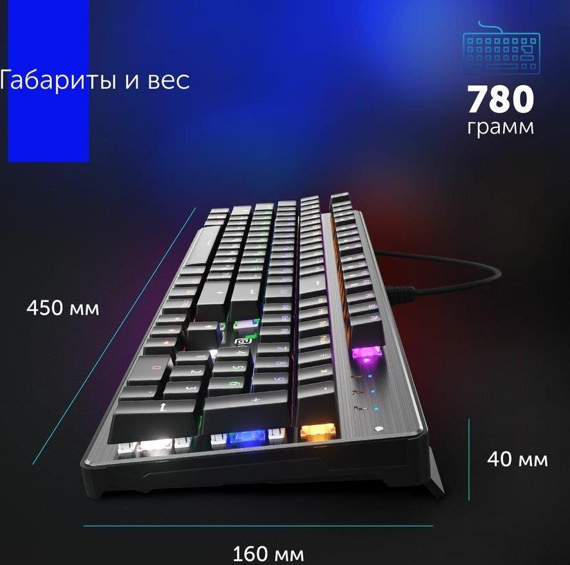 Интерфейс: USB. Мультимедийные дополнительные клавиши: есть. Для геймеров: да. Обычная/тонкая: обычная. Клавиатура с русскими буквами: да. Особенности: Anti-Ghosting неограниченное количество одновременных нажатий Ресурс клавиш до 50 000 000 нажатий Мультимедийные клавиши (FN-F1-F12) 6 цветов подсветки 5 увроней яркости кабель в прочной плетеной оплетке 10 режимов подсветки. Тип: Клавиатура. Дизайн клавиш: квадратные. Длина кабеля: 1.5. Цвет английских букв: серый. Цвет русских букв: серый. Цвет клавиш: черный. Цвет корпуса клавиатуры: черный. Материал корпуса: пластик/металл. Механическая: да. Тип соединения: проводная. Количество клавиш: 87. Тип подсветки: многоцветная. Тип механических переключателей: Blue. Габариты упаковки (ед) ДхШхВ: 0.388x0.156x0.041. Вес упаковки (ед): 0.86. Комплектация: Полную комплектацию товара уточняйте у производителя. Гарантия: 12 мес.. Размеры клавиатуры (ШхВхГ): 360 х 35 х 160 мм. Цвет: черный. Особенности клавиш: интернет-клавиши. Тип механизма клавиш: механическая. Интерфей