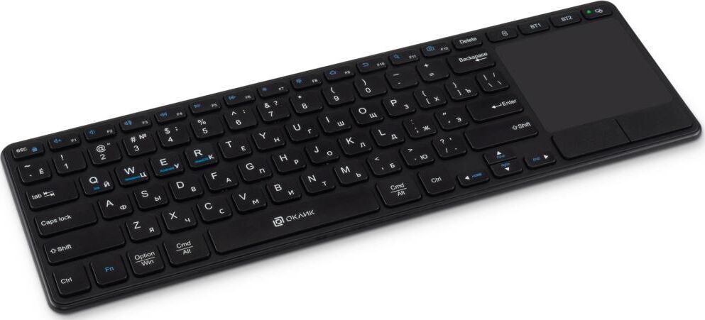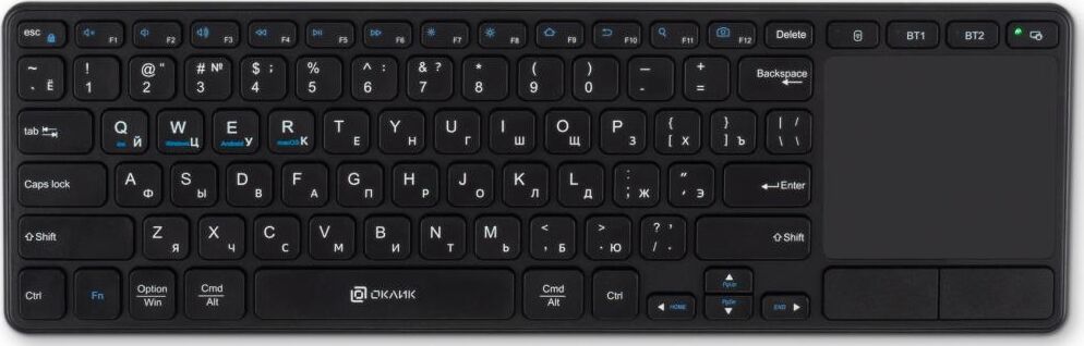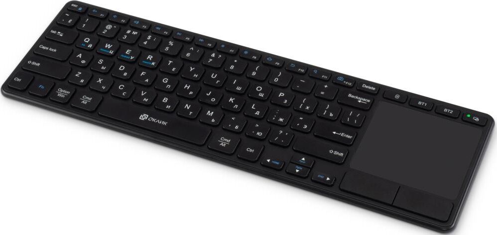 Интерфейс: USB. Тип беспроводного соединения клавиатуры: Радиоканал. Мультимедийные дополнительные клавиши: есть. Обычная/тонкая: тонкая(slim). Клавиатура с русскими буквами: ДА. Дизайн клавиш: квадратные. Панель Multi Touch: есть. Радиус действия клавиатуры: 10. Количество элементов питания: 2. Тип элементов питания: ААА. Максимальное время работы: нет. Цвет английских букв: белый. Цвет русских букв: белый. Вес: 0.51. Тип соединения: беспроводная. Количество клавиш: 85. Габариты упаковки (ед) ДхШхВ: 0.385x0.027x0.122. Вес упаковки (ед): 0.7. Гарантия: 12 мес.. Размеры клавиатуры (ШхВхТ): 370 х 15 х 117 мм. Цвет: и черный. Конструктивные особенности: сенсорная панель. Особенности клавиш: кнопки-дубли клавиши мыши. Особенности: мультимедийная, тонкая(slim). Беспроводной интерфейс: Радиоканал. Цвет русских букв: белый. Интерфейс: USB. Цвет английских букв: белый. Тип соединения: беспроводная