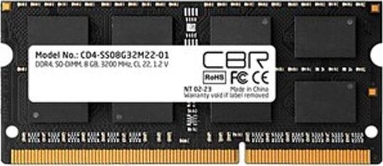 Модуль памяти CBR CD4-SS08G26M19-01 SODIMM DDR4 емкостью 8ГБ, частотой 2666МГц (PC4-21300), non ECC, предназначен для использования в ноутбуках. DDR4, объём: 1 модуль на 8Gb, тактовая частота: 2666 MHz, форм-фактор: SODIMM 260-контактный, скорость: PC-21300, поддержка ECC: нет, Low Profile: нет, Registered: нет, CD4-SS08G26M19-01