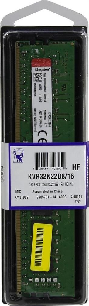 Оперативная память KINGSTON Память 16GB 3200MHz KVR32N22D8/16 VALUERAM RTL PC4-25600 CL22 DIMM 288-pin 1.2В dual rank R