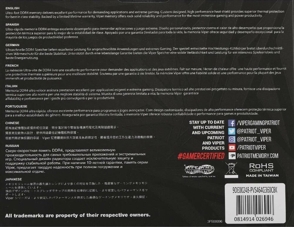 Оперативная память PATRIOT Модуль памяти DIMM DDR4-3600 64GB (32GBx2) PVS464G360C8K