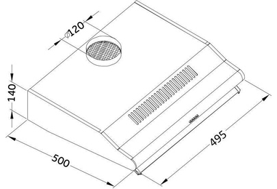 Цвет корпуса - белый,Мощность - 140Вт,Размеры вытяжки (ШхГхВ) - 495х500х140,Максимальный уровень шума (dB) - 54,Подсветка - 2 x E14 40W,Диаметр выхода - 120мм,Управление - кнопочное ,Тип фильтра - фильтр угольный №2