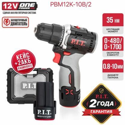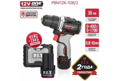 P.I.T. Дрель аккум. бесщёточная PBM12K-10B/2 X-DRIVER (12В, 35Нм, 10 мм, 2ск, 2 акб 2,0Ач, ЗУ, кейс)