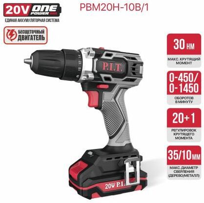 P.I.T. Дрель аккум. PBM20H-10B/1 (20В, 30Нм, патрон 10 мм, 2 ск, 1 акб 2Ач, ЗУ, кейс)