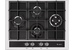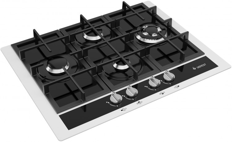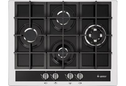 Газовая варочная панель шириной 67 см, стеклянная поверхность черного цвета с белой рамкой. Четыре конфорки различной мощности и диаметра расположены ромбом и дополнены составными чугунными решетками. Поворотные переключатели декорированы в цвет окантовки, мощность пламени регулируется вращением ручки, есть фиксированное положение для экономного горения - "малое пламя". Электроподжиг встроен в переключатели. Помимо стандартной горелки есть конфорка малого диаметра и большая, двухзонная горелка для быстрого и мощного нагрева. Все конфорки оснащены газ-контролем.