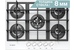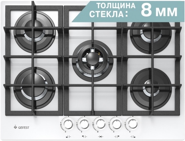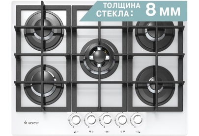 Газовая варочная панель, белого цвета поверхность - стеклянная, с толщиной в 8 мм. Пять конфорок размещены на рабочем столе шириной 70 см, монтажный проем позволяет встраивание в мебельный корпус шириной 60 см. Газовые горелки расположены на широком защитном основании, сверху накрываются чугунными решетками (составные, 3 панели). Все конфорки - различного диаметра и мощности, оснащены газ-контролем (перекрывает подачу газа к горелке при угасании пламени). Электроподжиг встроен в поворотные ручки, мощность пламени регулируется поворотом переключателя, есть фиксированное положение "малое пламя" - минимально возможное горение. Для быстрой обжарки продуктов на тонкостенной посуде и нагрева большой кастрюли с водой - предусмотрена двухзонная конфорка, с двумя рядами пламени.