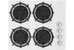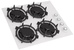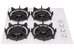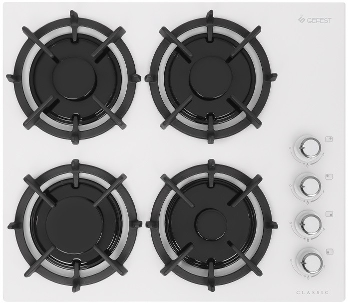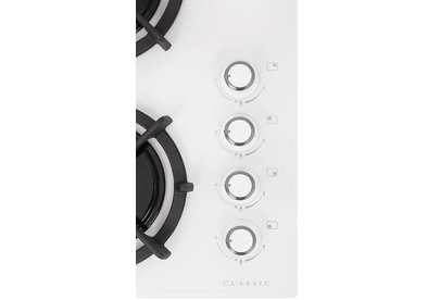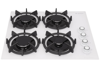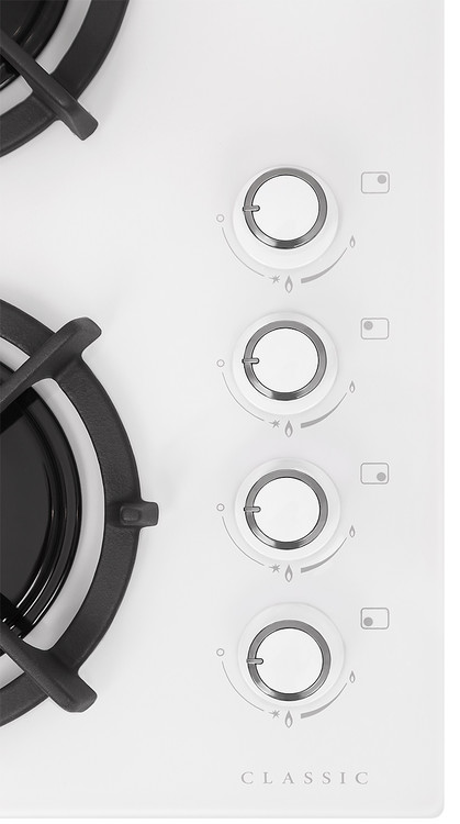 Белого цвета варочная панель со стеклянной поверхностью, ширина 60 см. Поворотные ручки декорированы накладками, плавная регулировка мощности горения дополнена фиксированным положением (малое пламя). Сами горелки защищены составными фигурными решетками из чугуна, оснащены газ-контролем. Электроподжиг происходит автоматически, при повороте переключателя. Конфорки имеют различный размер и мощность, две средние дополнены большой и малой, экономичной.