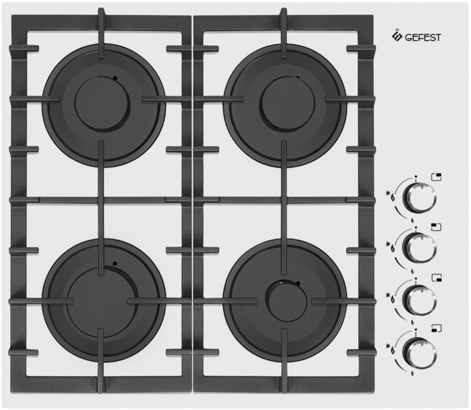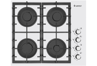 Газовая варочная панель шириной 60 см, стеклянная рабочая поверхность - белого цвета. Управление газовыми горелками осуществляется поворотными переключателями, вынесенными на край панели. Мощность горения определяется пользователем прибора самостоятельно, для экономного горения предусмотрено фиксированное положение - малое пламя. Четыре конфорки (две стандартные, большая и малая) оснащены автоматическим электроподжигом, встроенным в ручки управления и газ-контролем. Фигурные чугунные решетки надежно защищают горелки и выдерживают вес тяжелой металлической посуды.