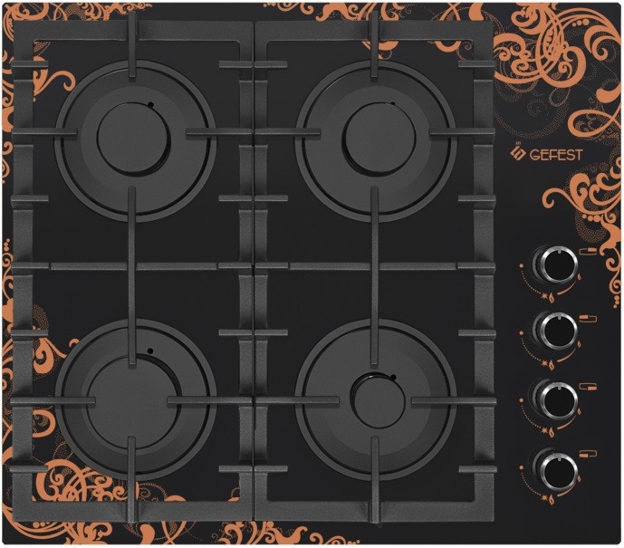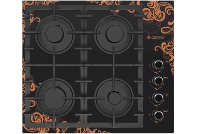 Газовая варочная панель шириной 60 см, стеклянная рабочая поверхность - черного цвета. Декорированные ручки, на стекло нанесен рисунок. Управление газовыми горелками осуществляется поворотными переключателями, вынесенными на край панели. Мощность горения определяется пользователем прибора самостоятельно, для экономного горения предусмотрено фиксированное положение - малое пламя. Четыре конфорки (две стандартные, большая и малая) оснащены автоматическим электроподжигом, встроенным в ручки управления и газ-контролем. Фигурные чугунные решетки надежно защищают горелки и выдерживают вес тяжелой металлической посуды.
