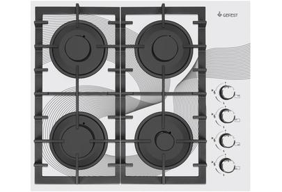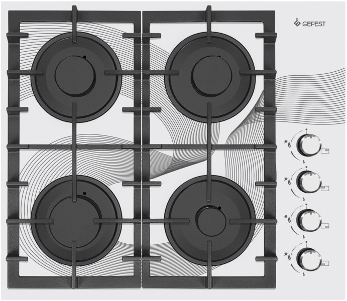Газовая варочная панель шириной 60 см, стеклянная рабочая поверхность - белого цвета. На стекло нанесен рисунок. Управление газовыми горелками осуществляется поворотными переключателями, вынесенными на край панели. Мощность горения определяется пользователем прибора самостоятельно, для экономного горения предусмотрено фиксированное положение - малое пламя. Четыре конфорки (две стандартные, большая и малая) оснащены автоматическим электроподжигом, встроенным в ручки управления и газ-контролем. Фигурные чугунные решетки надежно защищают горелки и выдерживают вес тяжелой металлической посуды.