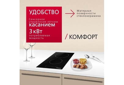 Установка рабочей поверхности: независимая. Дизайн ДОМИНО: да. Материал рабочей поверхности: стеклокерамика. Количество электрических конфорок: 2. Управление: электронное. Тип таймера: электронный. Мощность подключения: 3. Вес (нетто): 4.7. Тип: электрическая. Расположение панели управления: спереди. Длина сетевого шнура: 1.2. Общее количество конфорок: 2. Габариты упаковки (ед) ДхШхВ: 0.57x0.36x0.105. Вес упаковки (ед): 5.2. Гарантия: 12 мес.. Передняя конфорка: размер 165 мм. Задняя конфорка: размер 200 мм. Цвет: черный. Размеры ниши для встраивания (ШхГxВ): 270x490. Размеры(ШхГхВ): 290х520х50 мм. Безопасность: блокировка управления (защита от детей). Таймер: с автоотключением. Тип переключателей: сенсорные. Тип конфорок: Hi-Light. Индикация: остаточного тепла. Материал поверхности: стеклокерамика. Количество конфорок: 2. Переключатели: спереди, сенсорные. Безопасность: блокировка управления (защита от детей)