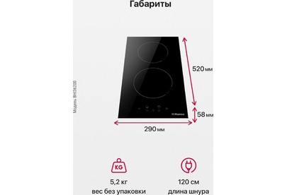 Установка рабочей поверхности: независимая. Дизайн ДОМИНО: да. Материал рабочей поверхности: стеклокерамика. Количество индукционных конфорок: 2. Управление: электронное. Тип таймера: электронный. Дисплей: есть. Мощность подключения: 2.9. Вес (нетто): 5.2. Тип: индукционная. Расположение панели управления: спереди. Длина сетевого шнура: 1.2. Общее количество конфорок: 2. Габариты упаковки (ед) ДхШхВ: 0.57x0.36x0.11. Вес упаковки (ед): 5. Гарантия: 12 мес.. Передняя конфорка: размер 180 мм. Задняя конфорка: размер 160 мм. Цвет: черный. Размеры ниши для встраивания (ШхГxВ): 270x490. Размеры(ШхГхВ): 290х520х58 мм. Индикация: выбранной мощности, остаточного тепла. Безопасность: блокировка управления (защита от детей), распознавание наличия посуды. Тип переключателей: сенсорные. Тип конфорок: индукционные. Безопасность: блокировка управления (защита от детей), распознавание наличия посуды. Материал поверхности: стеклокерамика. Переключатели: спереди, сенсорные. Количество конфорок: 2