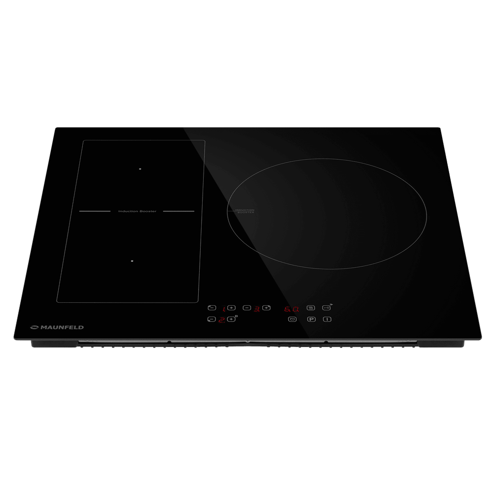 Индукционная варочная панель Maunfeld CVI593BBK — функциональная модель с эффектным современным дизайном и продуманной конструкцией. Поверхность плиты выполнена из стеклокерамики черного цвета. Элементы нанесены на нее с помощью тонких белых линий, подчеркивающих элегантный внешний вид устройства. Сенсорная панель расположена по центру, тем не менее, благодаря используемым материалам, можно не опасаться ее нагрева во время готовки. Индикация степени нагрева осуществляется с помощью красной подсветки. Конфорки обозначены схематично. Эта модель эргономична, имеет множество нужных функций и будет прекрасно смотреться на любой кухне. Индукционная варочной панели Маунфилд CVI593BBK состоит из трех конфорок разной формы и диаметры, что позволяет готовить в посуде любого размера. Слева находятся две зоны нагрева, которые могут быть объединены с помощью технологии FlexZone. Справа расположена большая конфорка, идеально подходящая для использования с крупной посудой. Большим преимуществом этой модели являетс