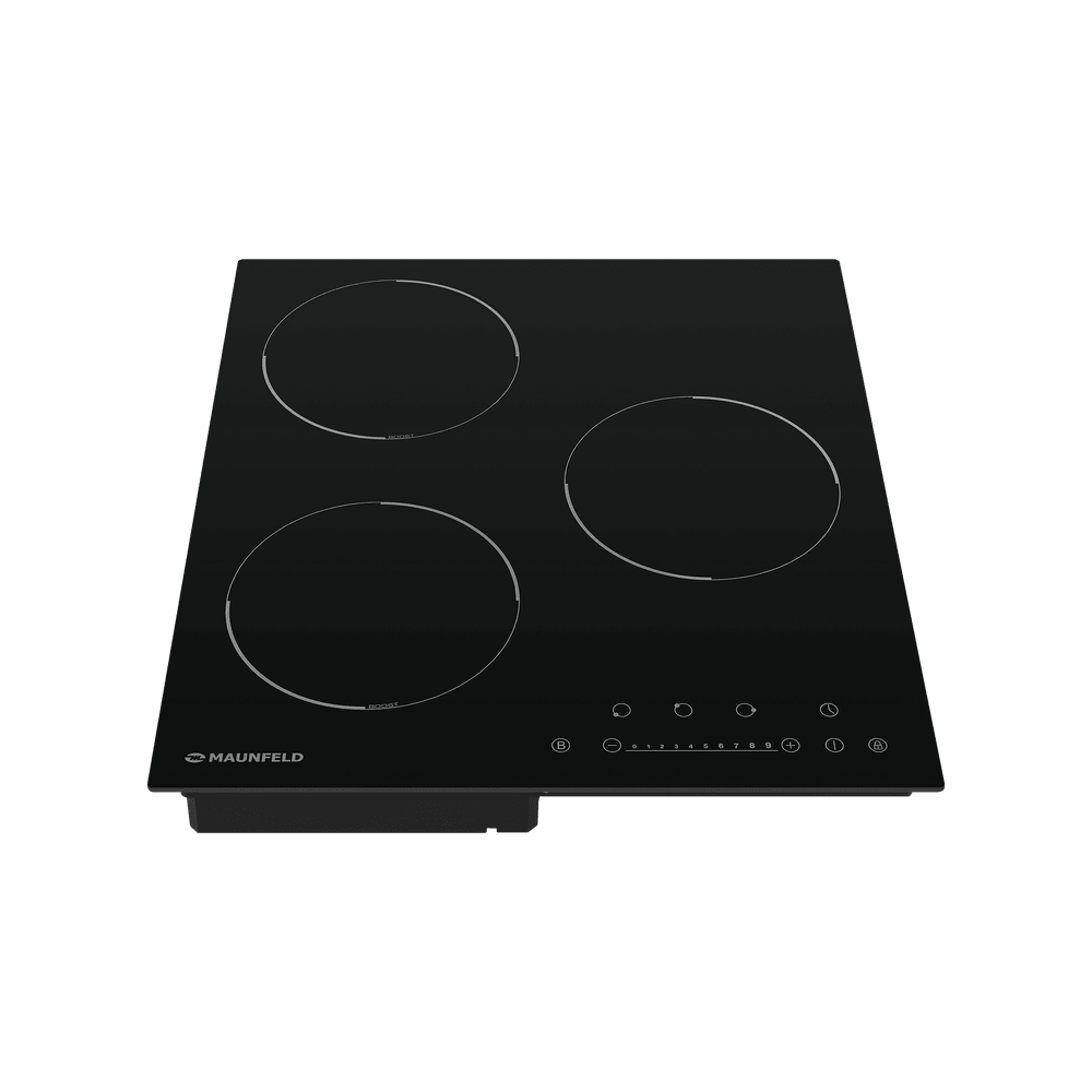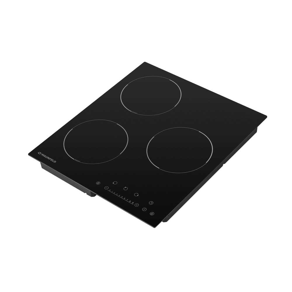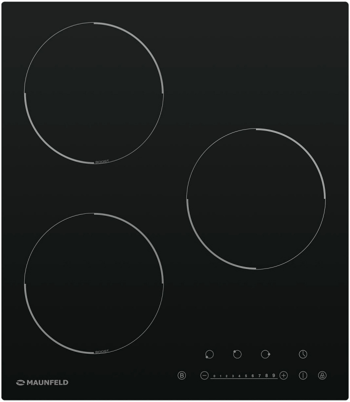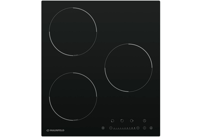 Индукционная варочная панель Maunfeld EVI.453-BK представлена в элегантной черной расцветке с тремя мощными конфорками. Данная модель компактно встраивается в столешницу кухонного гарнитура Все 3 ее варочной зоны очень быстро нагревают дно посуды и предельно рационально расходуют электроэнергию. Для использования подходят кастрюли и сковороды из чугуна, эмалированной и хромистой стали. Данное оборудование оснащено 9 ступенями мощности, имеется детектор диаметра посуды. На сенсорной панели управления расположены кнопки включения, выбора конфорок, таймер и регуляторы температуры. Легким нажатием на специальные клавиши можно активировать кратковременный режим повышенной мощности Booster и блокировку меню от детей. Первый пригодится, если Вы очень спешите и нужно, что вода в кастрюле закипела максимально быстро. Благодаря самодиагностике неисправностей Вы будете точно знать, что именно пошло не так. Варочные зоны автоматически приостанавливают работу, когда фиксируется чрезмерная темпера