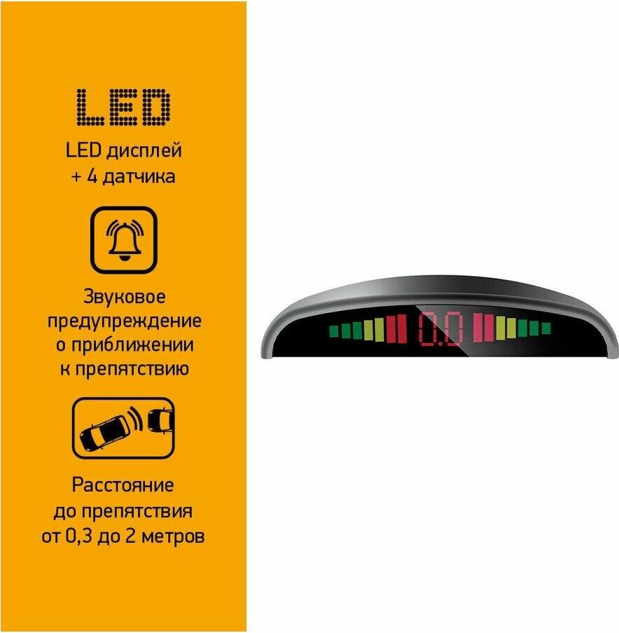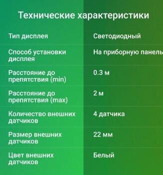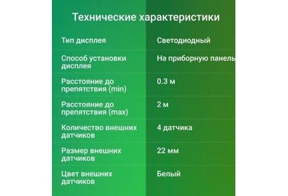 Тип дисплея светодиодный Способ установки дисплея на приборную панель Количество внешних датчиков 4 датчика Размер внешних датчиков 22 мм Цвет внешних датчиков белый