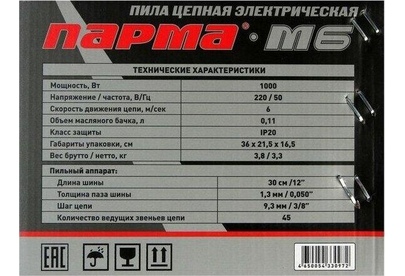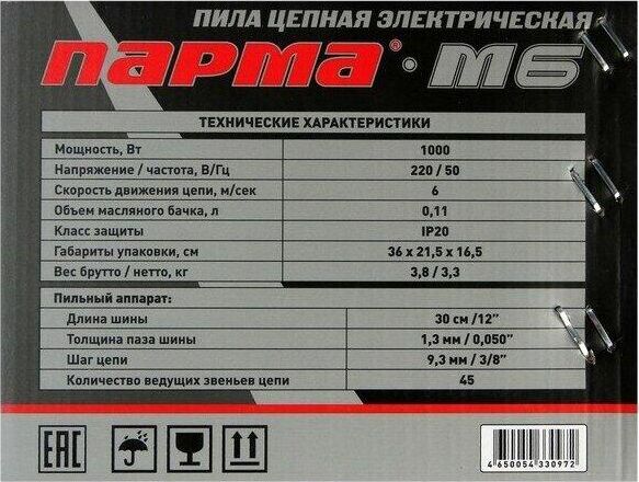 ПАРМА Цепная пила М 6 от сети 1000Вт дл.шины:12" (30cm) (02.005.00008)