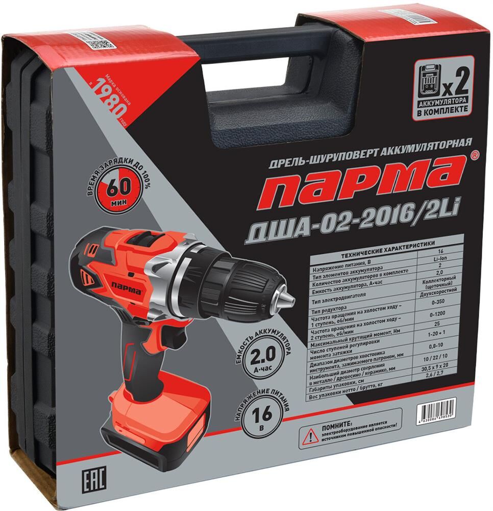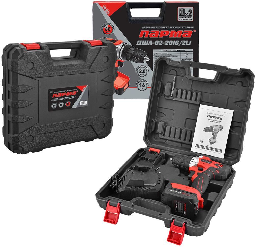 ПАРМА Дрель-шуруповерт ДША-02-2016/2Li, 2Ач, с двумя аккумуляторами [02.021.00015]