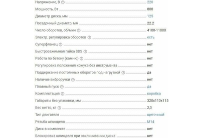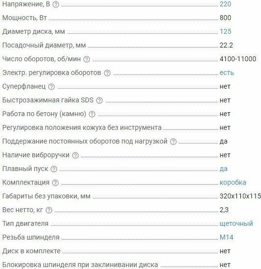Мощность: 800. Регулировка частоты оборотов: есть. Диаметр шлифовального круга: 125. Резьба шпинделя: M14. Система гашения вибрации: нет. Блокировка шпинделя: нет. Плавный пуск: есть. Защита от непреднамеренного включения: нет. Поворот рабочей головки: нет. Вес товара: 2.3. Особенности: Поддержание постоянных оборотов под нагрузкой. Электронная регулировка частоты оборотов. Дополнительная защита электродвигателя от пыли. Усиленный редуктор в металлическом корпусе. Вспомогательная боковая рукоятка. Легкий доступ к щеточному узлу.. Комплект поставки: Углошлифовальная машина, инструкция.. Суперфланец: нет. Тип электропитания: от электросети. Габариты упаковки (ед) ДхШхВ: 0.325x0.11x0.115. Вес упаковки (ед): 2.4. Тип электрического двигателя: щеточный. Кейс в комплекте: нет. Бесключевая замена оснастки: нет. Датчик падения: нет. Защита двигателя от перегрева: нет. Класс инструмента: бытовой. Общее количество рукояток: 2. Количество скоростей: 6. Поддержание постоянных оборотов под нагрузкой: есть. Посадочный диам