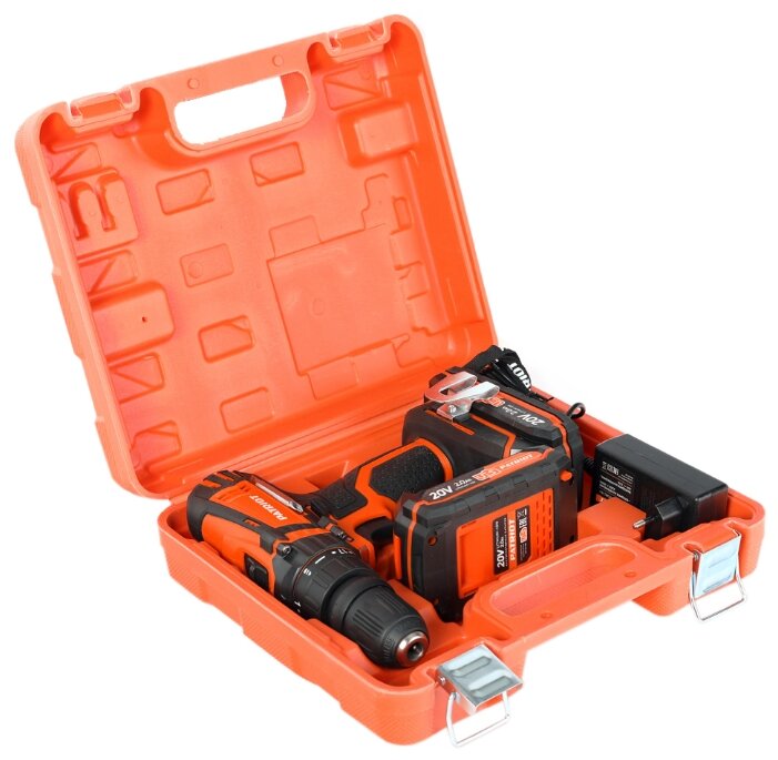 дрель-шуруповерт аккумуляторная, аккумулятор (2 шт.), зарядное устройство, двусторонняя бита, инструкция с гарантийным талоном, кейс