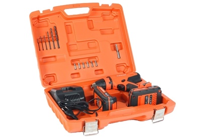 два аккумулятора, зарядное устройство, набор сверл и бит, кейс