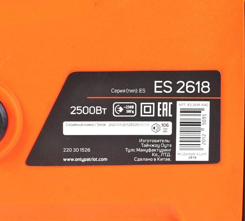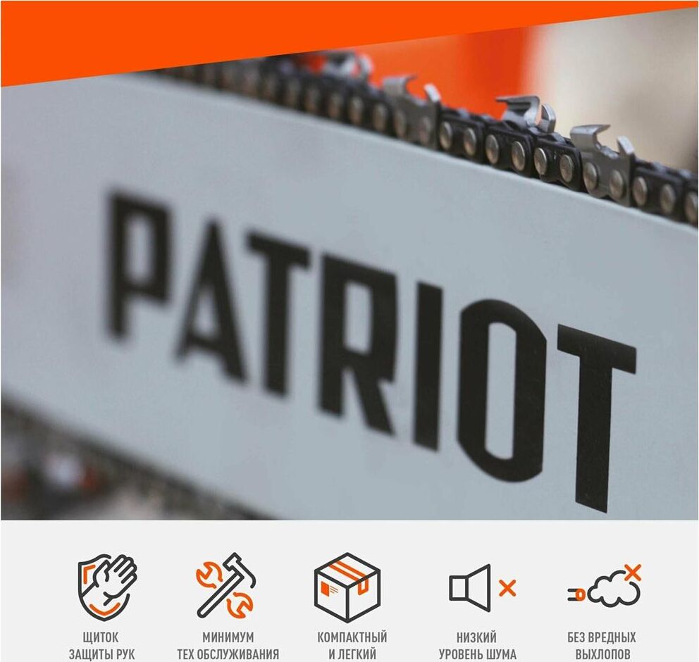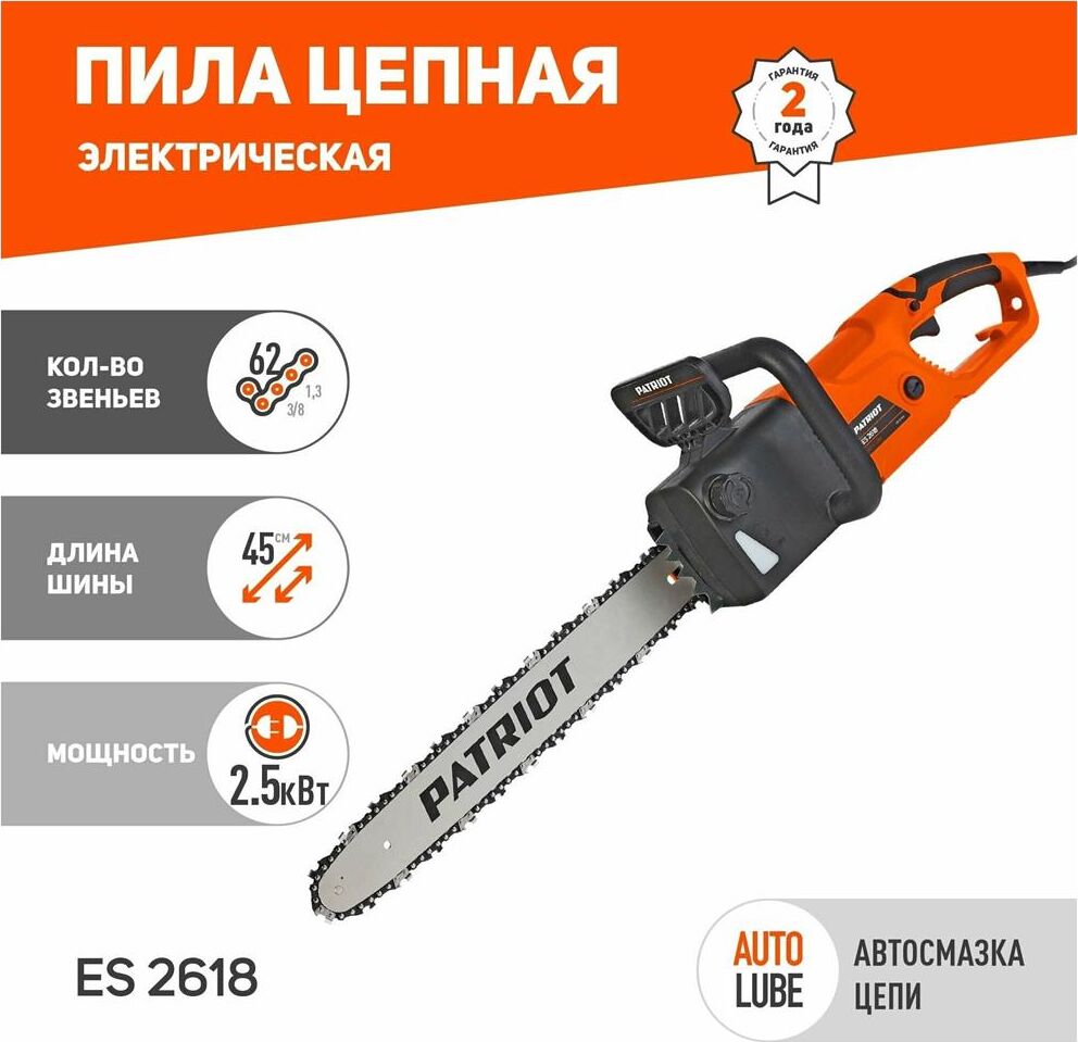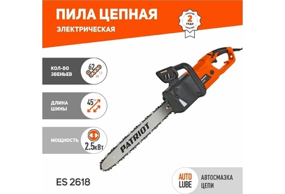 PATRIOT 220301526 ES 2618, 2.5кВт,18 шина, продольный двигатель, плавный пуск, бесключевая натяжка ц