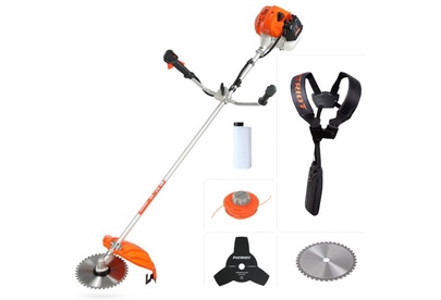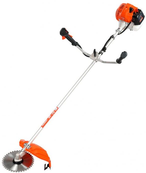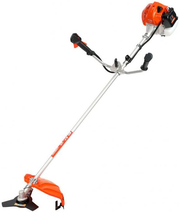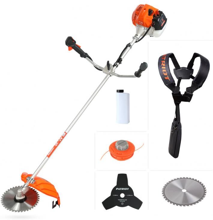 Мощность двигателя, л.с. 3. Объем двигателя, см3- 52. Тип двигателя 2-х тактный бензиновый. Диаметр режущей лески, мм 3. Диаметр режущего ножа, см 25.5. Пильный диск 40Т+3Т. Ширина скашивания, см 42. Тип рукоятки U-образная (велосипедная). Приводной вал жесткий. Легкий старт . Тип топлива смесь 32: 1 (бензин АИ 92 + масло Patriot G-Motion). Объем топливного бака, л 0,95.