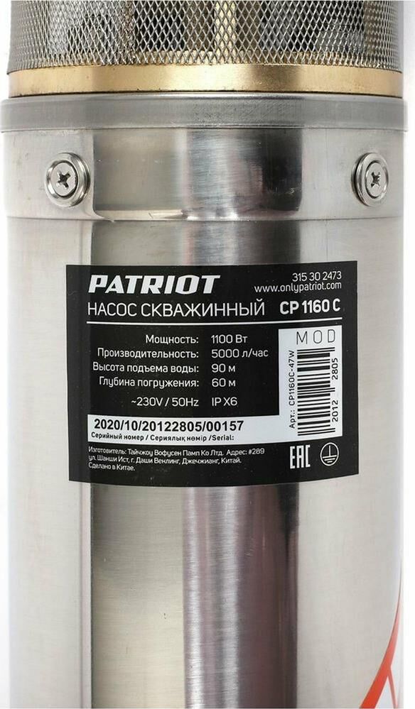 PATRIOT 315302473 CP 1160 C Насос скважинный центробежный насос, 1100 вт, 5000 л/час, 90 м высота.