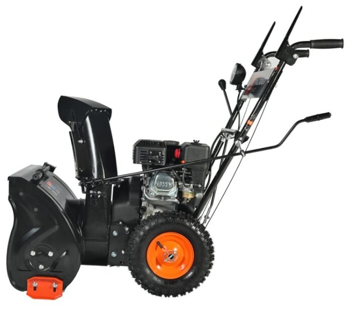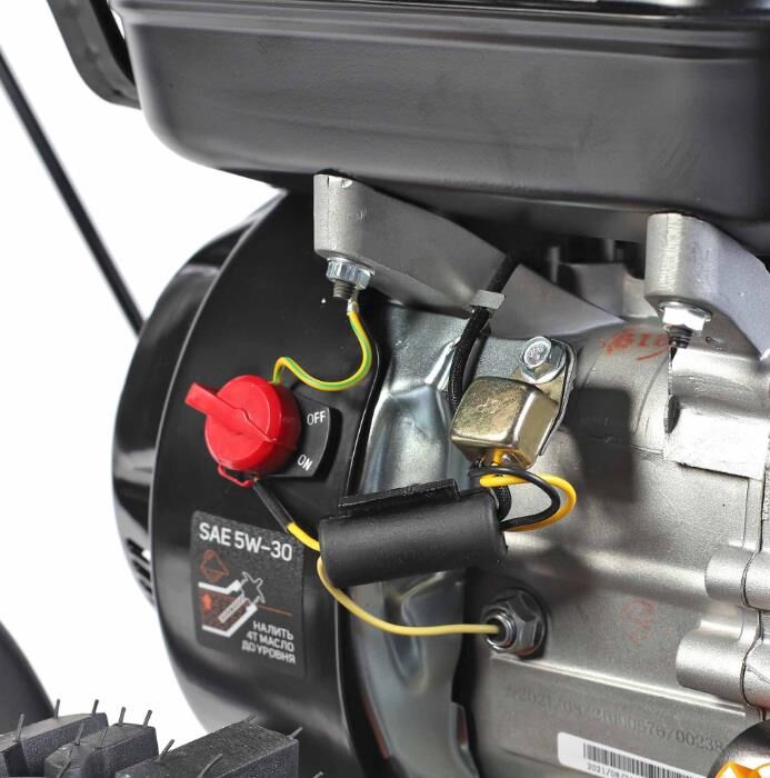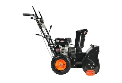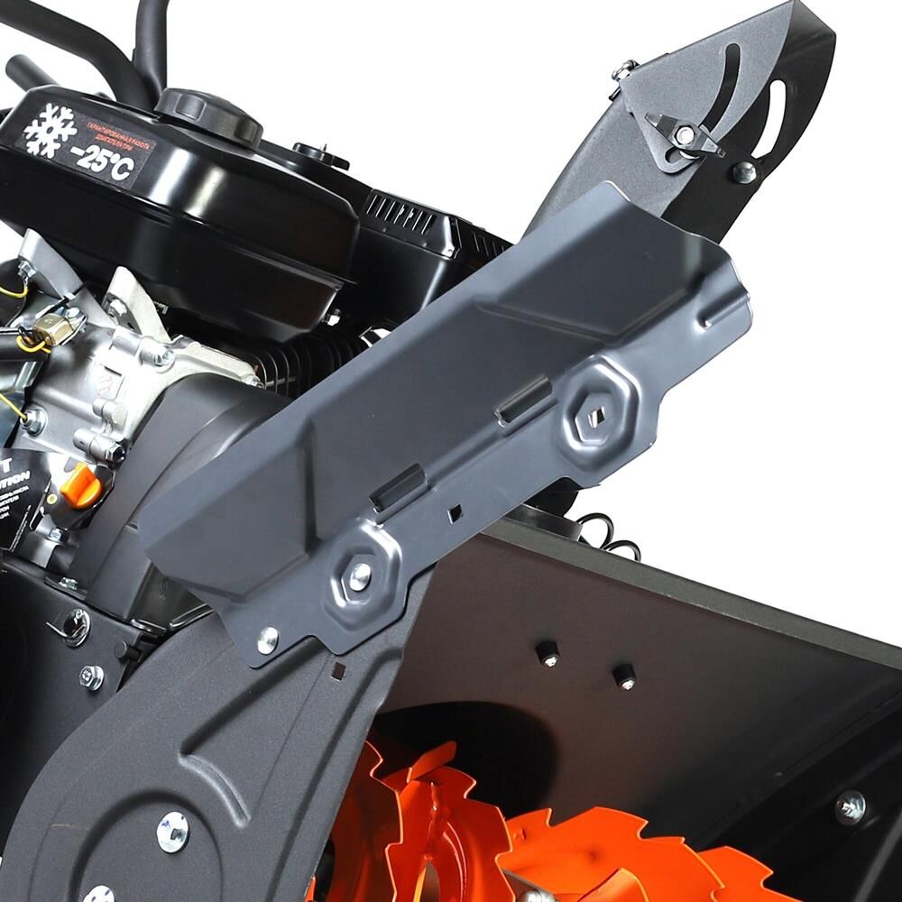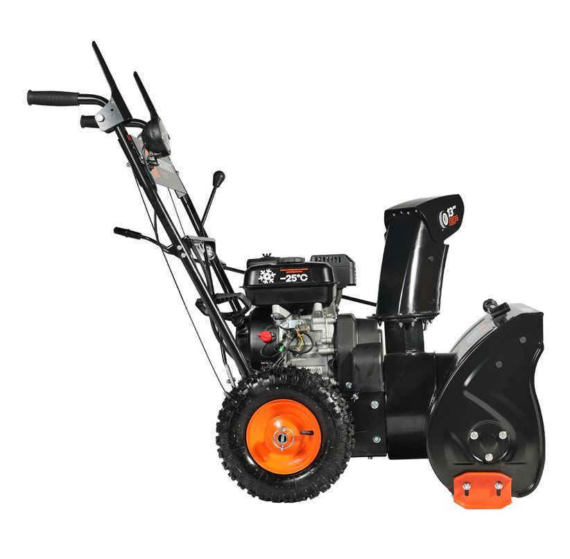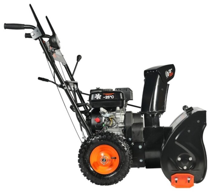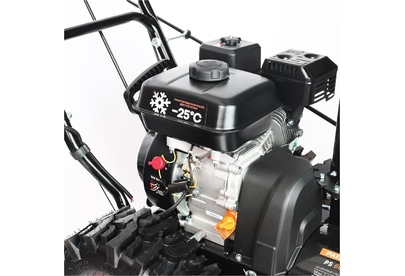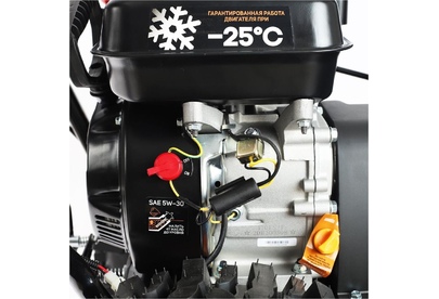 гарантированная работа двигателя при -25 ⁰ C, направление выброса снега 70⁰ , тип топлива: бензин АИ-92, емкость масляного картера 0.6 л, тип колес: Winter Extreme