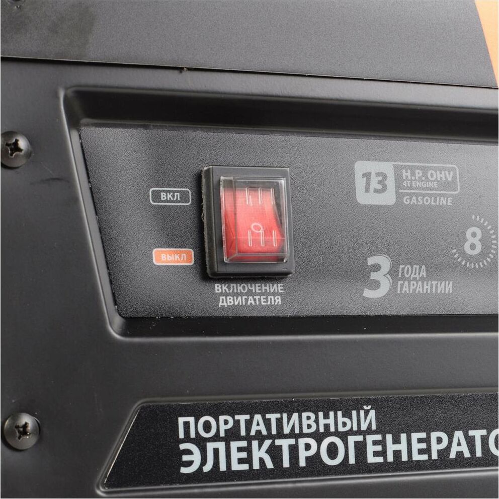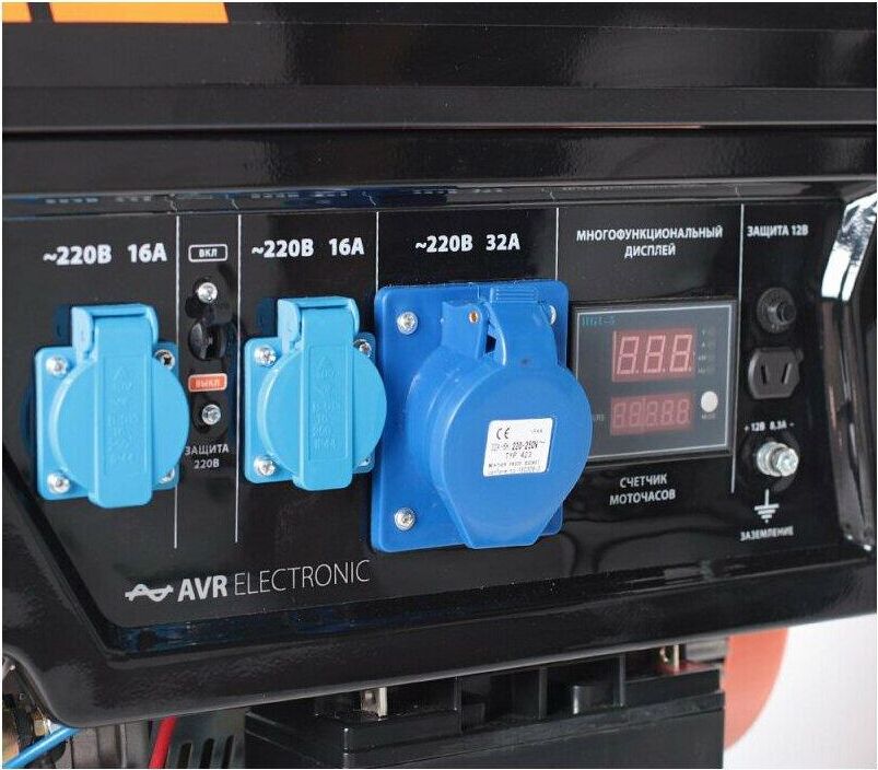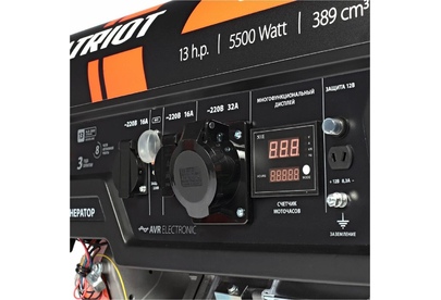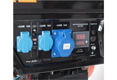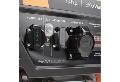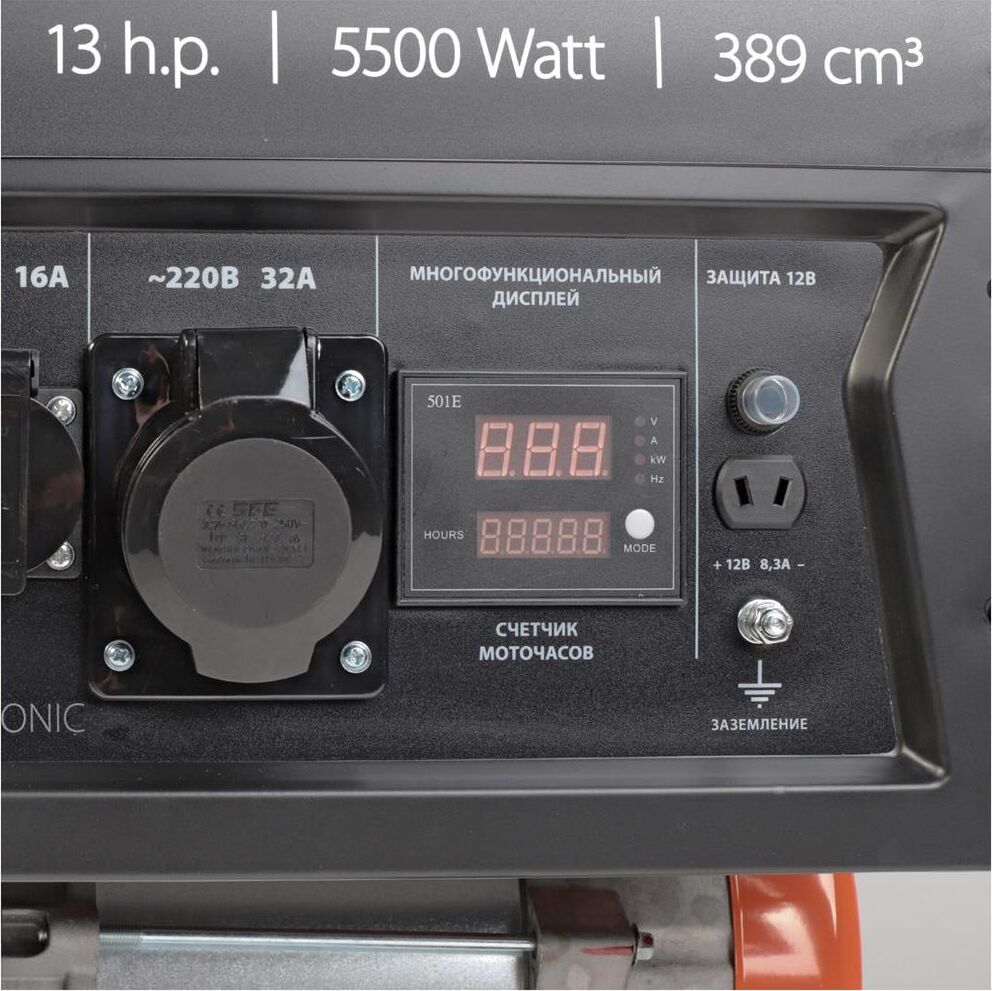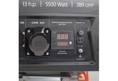 Объем двигателя, см3 389, Макс. мощность, л.с. 13, Тип топлива АИ-92, Объём бака, л 25, Тактность двигателя 4-х тактный, Номинальное напряжение, В 220, Мощность ном/макс, кВт 5.0/5.5, Расход топлива, г/кВт 440, Уровень шума, dB 78, Стартер ручной, Вольтметр электронный мультидисплей, Розетки 2 евро 16А, 1 евро 32А, Комплект для транспортировки опция, Выход на 12B .