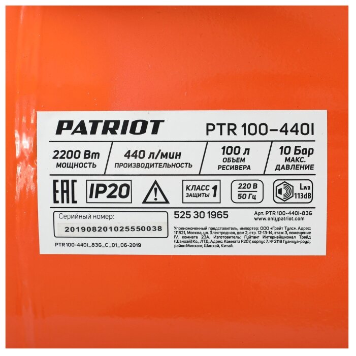 PATRIOT 525301965 PTR 100-440I Компрессор поршневой ременной