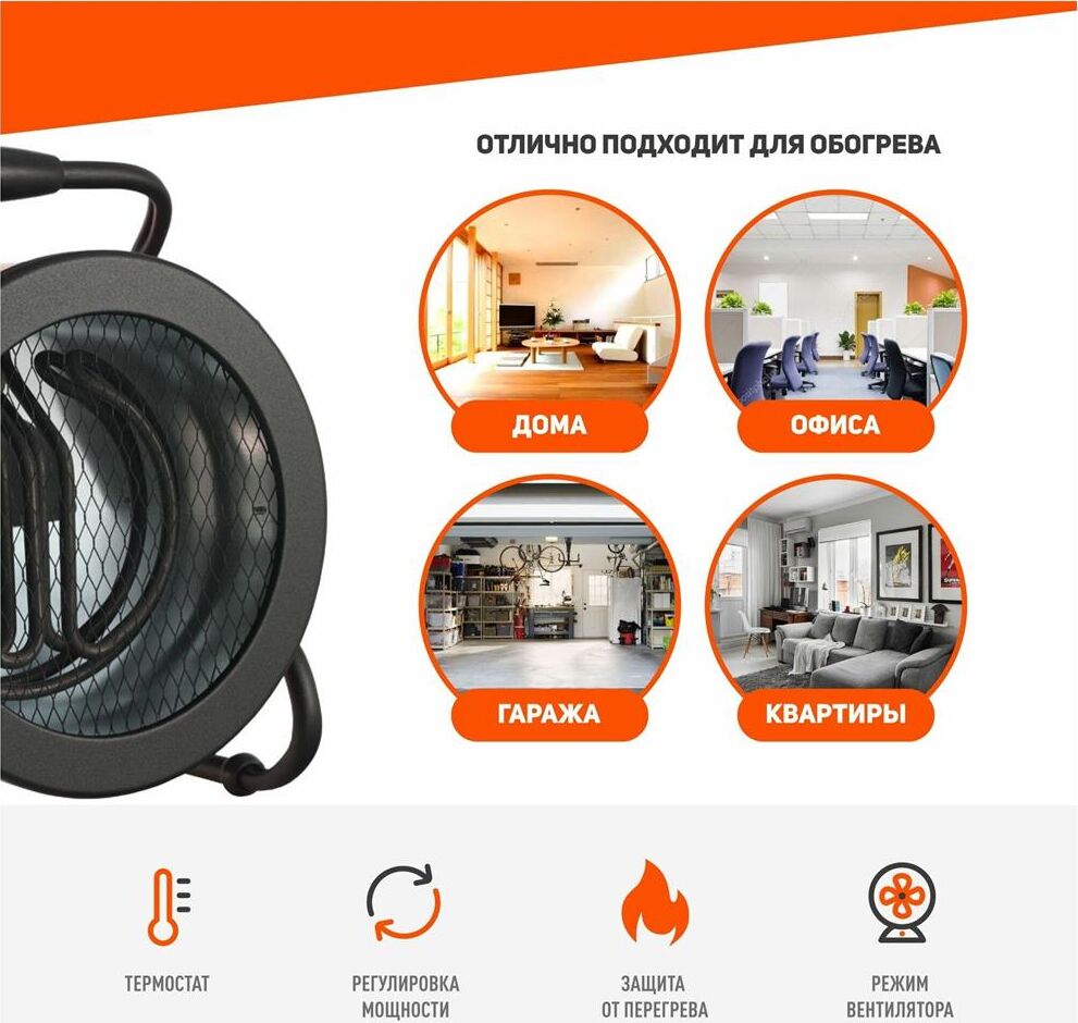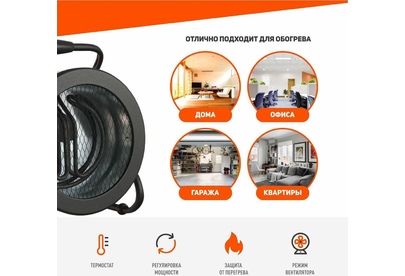 мощность по ступеням 1.5/3.0 кВт, 220В, ступенчатое регулирование мощности, нерж.ТЭН, шнур с евровилкой, цилиндрический корпус, поток воздуха 420м3/час, вес 3,5кг