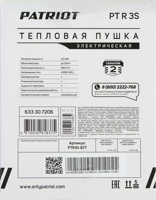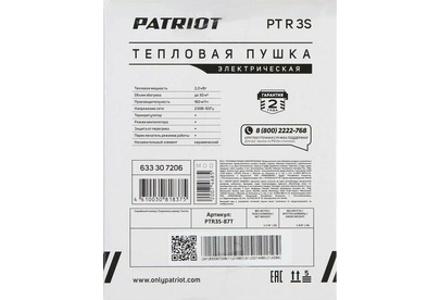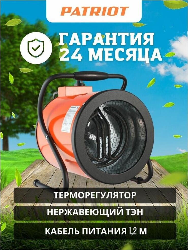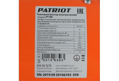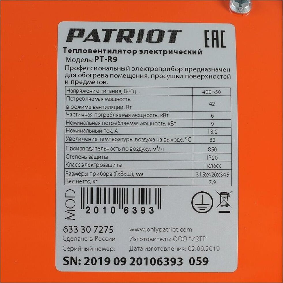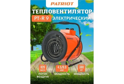 PATRIOT 633307275 PT-R 9 Тепловентилятор электрический 380В, терморегулятор, нерж.ТЭН, кабель питани