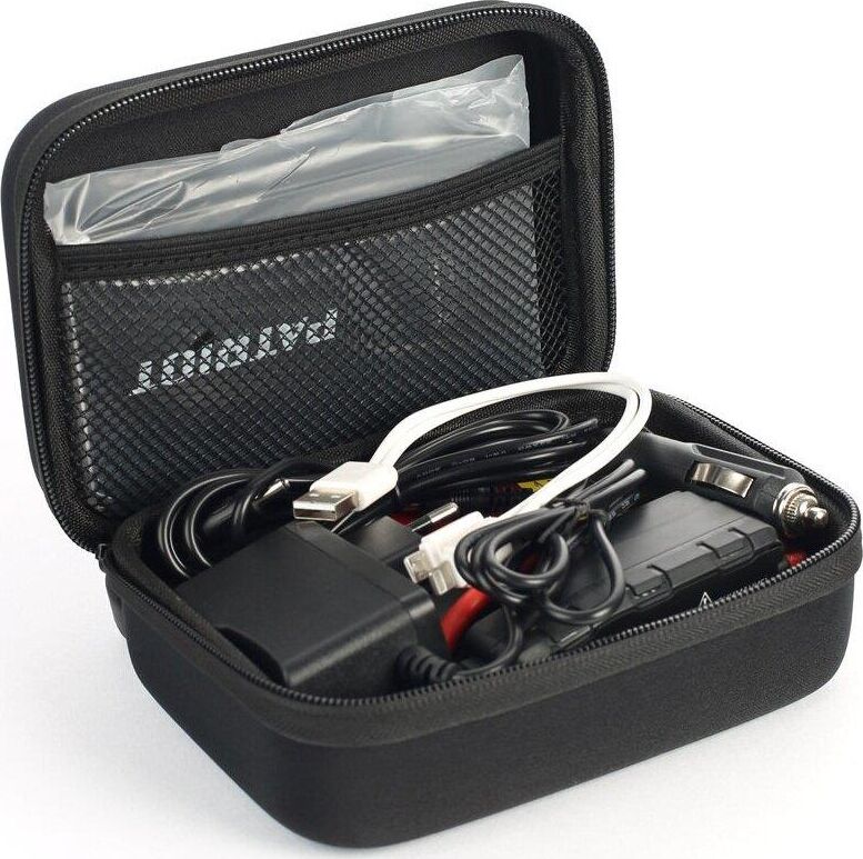 комплектация: сетевой адаптер, адаптер зарядки от прикуривателя автомобиля, силовые зажимы для подключения к автомобильному аккумулятору с защитой, адаптер для телефонов, кейс для хранения и транспортировки