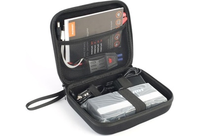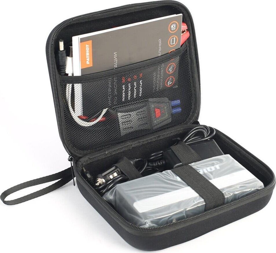 комплектация: сетевой адаптер, адаптер зарядки от прикуривателя автомобиля, кабель и разъемы для ноутбуков, силовые зажимы для подключения к автомобильному аккумулятору с защитой, адаптер для телефонов, кейс для хранения и транспортировки
