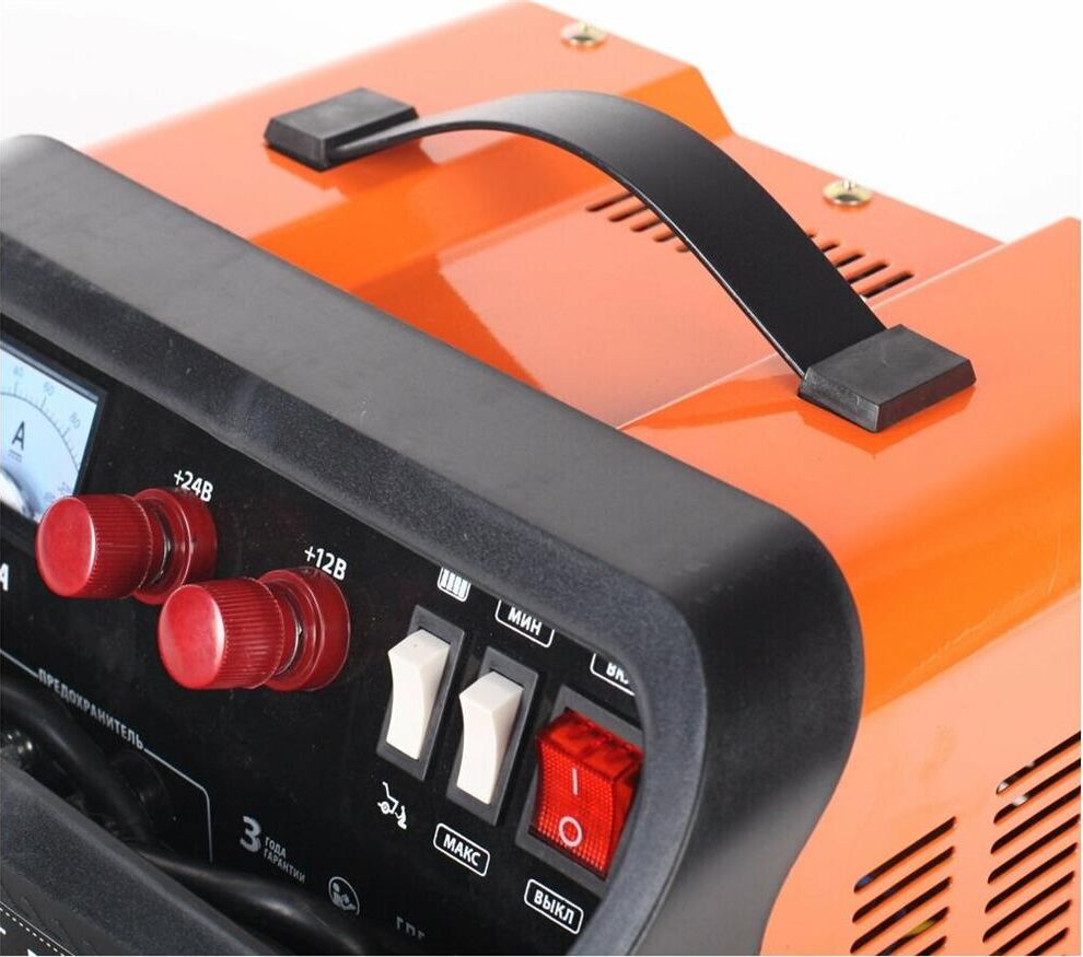 Устройство для бытового, полупрофессионального или профессионального использования. Предназначено для зарядки свинцовых, кислотных аккумуляторов напряжением 12В и 24В, облегчения запуска автомобиля в холодную погоду. 2 ступени зарядки тока. Ускоренный режим зарядки с повышенным током. Амперметр, защита от перегрузки, неправильной полярности, короткого замыкания.