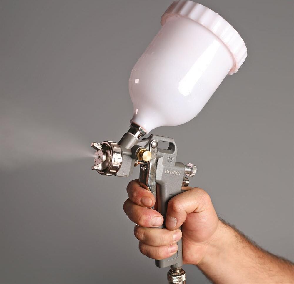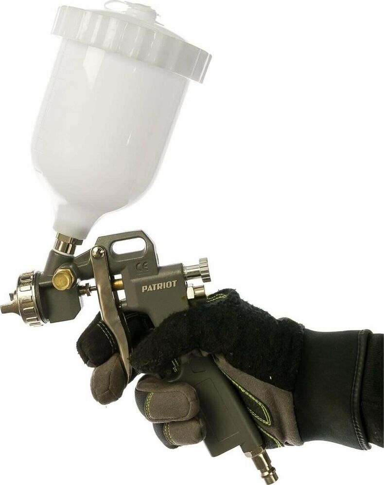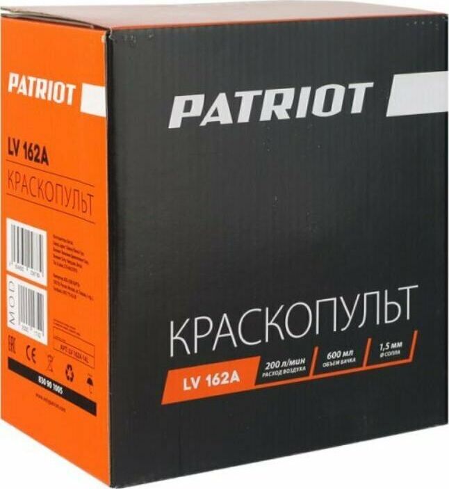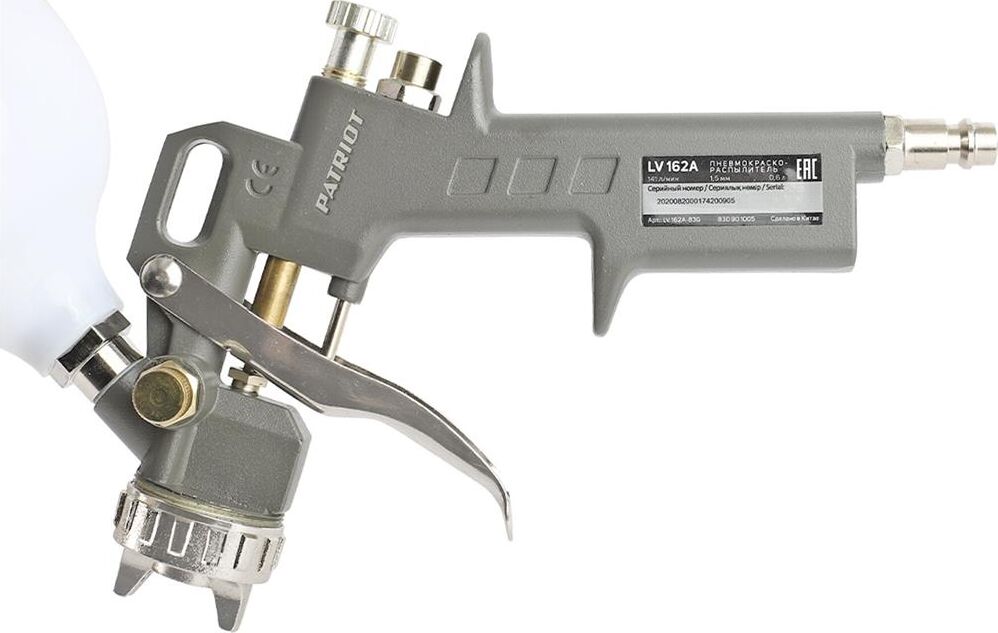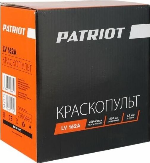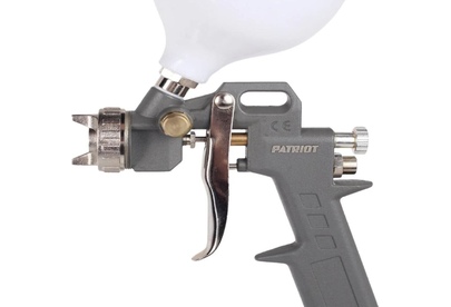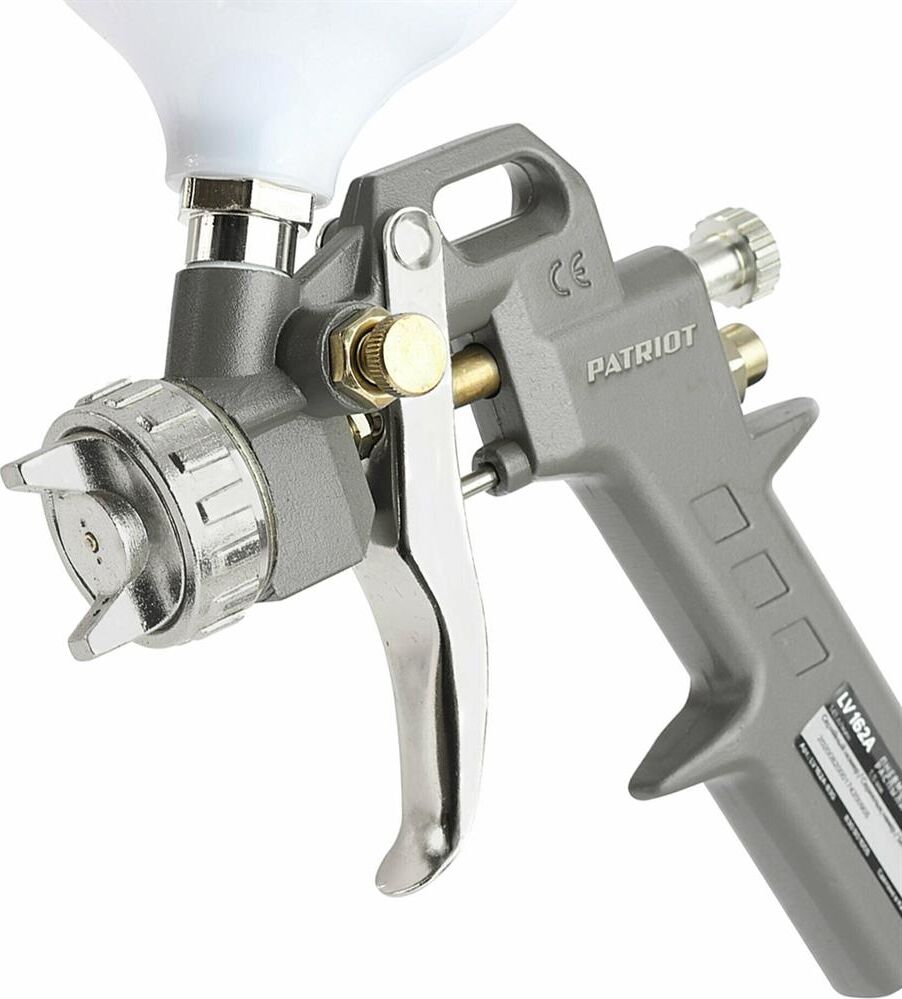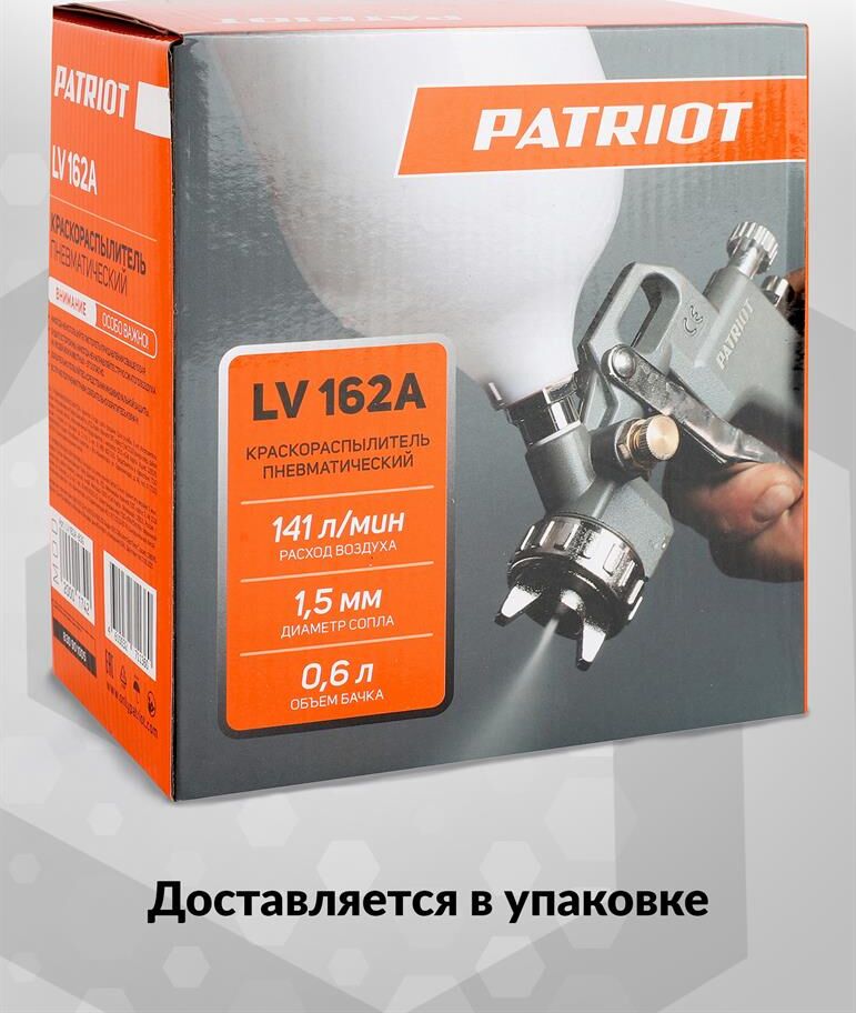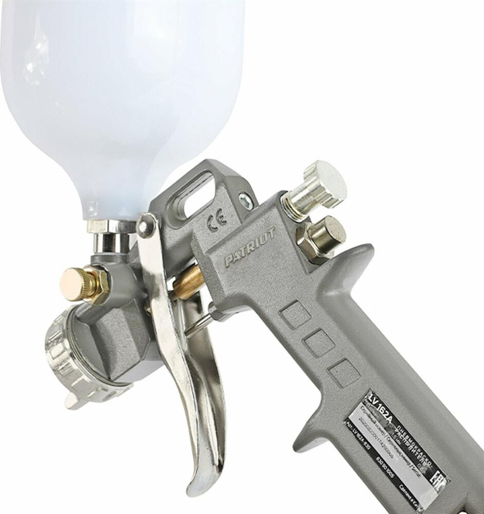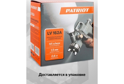 Пневмокраскораспылитель PATRIOT LV 162А, Расход воздуха: 400 л/мин; Объем бачка для краски: 0.5 л. верхний; Давление: 3.0-4.0 бар; Диаметр сопла: 1,5 мм; Ширина факела: 120-220 мм; Соединение: быстросъем.