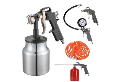 краскопульт с нижним бочком, продувочный пистолет, пистолет для накачки шин, промывочный пистолет, спиральный шланг 5м.