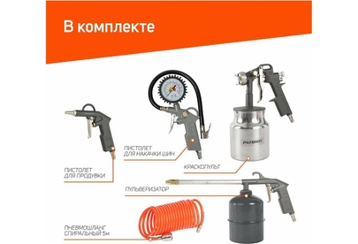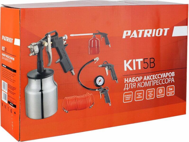 Набор окрасочного инструмента 5 предметов PATRIOT KIT 5В, быстросъем. Краскопульт н/б для всех типов краски; Пистолет для продувки; Пистолет для накачки шин; Шланг спиральный 5 метров; Пульверизатор.