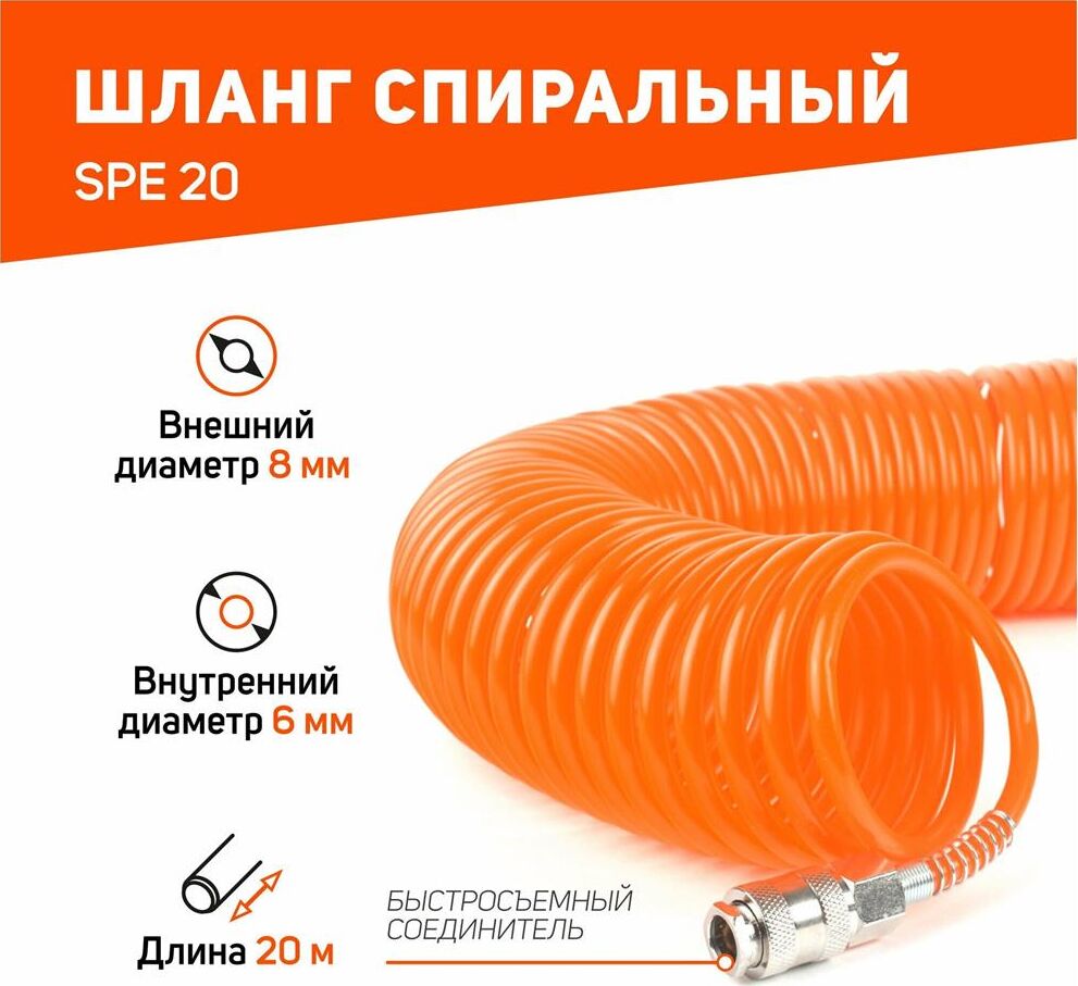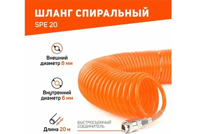 Шланг спиральный PATRIOT SPE 20, Макс. давление: 20 бар; Длина: 20 м; Диаметр внешний: 8 мм; Диаметр внутренний: 6 мм; Соединение: Rapid