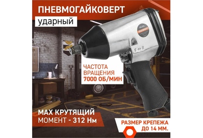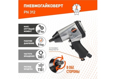 Пневмогайковерт ударный PATRIOT PN 312 подходит для закручивания крепежных элементов. Наличие удара и крутящий момент в 312 Нм позволяют работать с высоконагруженными соединениями. Наличие удара, Размер патрона 1/2 дюйма, Тип патрона квадрат с фрикционным кольцом, Диаметр воздушного штуцера, дюйм 1/4F, Тип соединения рапид (EURO), Давление, атм 6, Расход воздуха, л/мин 140, Max крутящий момент , Нм 312, Max размер крепежа, М, мм 14, Частота вращения шпинделя, об/мин 7000.