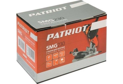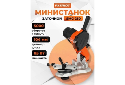 PATRIOT 880125328 SMG 230, мощность 85Вт, об/мин 5000, угол 35°, диаметр точильного диска 104мм Диаметр диска, мм 104 Частота вращения, об/мин 5000 Мощность, Вт 85 Диаметр посадочного места, мм 22 Угол поворота стола, ° 35 Прорезиненный морозостойкий кабель Да