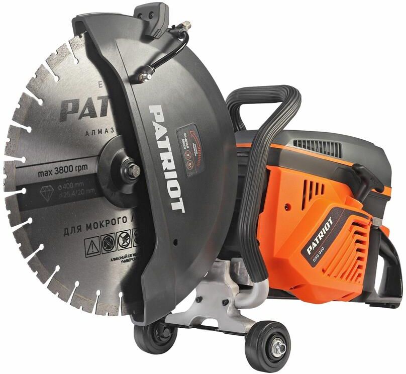 Бензорез PATRIOT DSG 940M применяется для сухой и мокрой резки различных материалов. В зависимости от установленной оснастки, можно использовать бензорез по бетону, кирпичу, бордюрам, асфальту и камню. Бензорез по металлу можно использовать со специальными абразивными дисками. Универсальный посадочный диаметр для удобного выбора режущего диска. Диаметр диска 400 мм обеспечивает глубину реза до 145 мм. Улучшенный стартер. Закрытая конструкция защищает от попадания в механизм стартера пыли и грязи, увеличивая его срок службы. Защита оператора Тормоз выбега диска останавливает диск за Долговечность Подпружиненный натяжитель поддерживает натяжение ремня, уменьшая его износ Разнообразие резов Возможность выполнения поперечных, разрывных и погружных надрезов. Удобство для пользователя Система Easy Start для легкого запуска двигателя Мощность и эффективность Двухтактный двигатель мощностью 6.5 л.с. (4.8 кВт) обеспечивает высокую производительность. Защита двигателя Двухступенчатая система фильтрации (предварительный