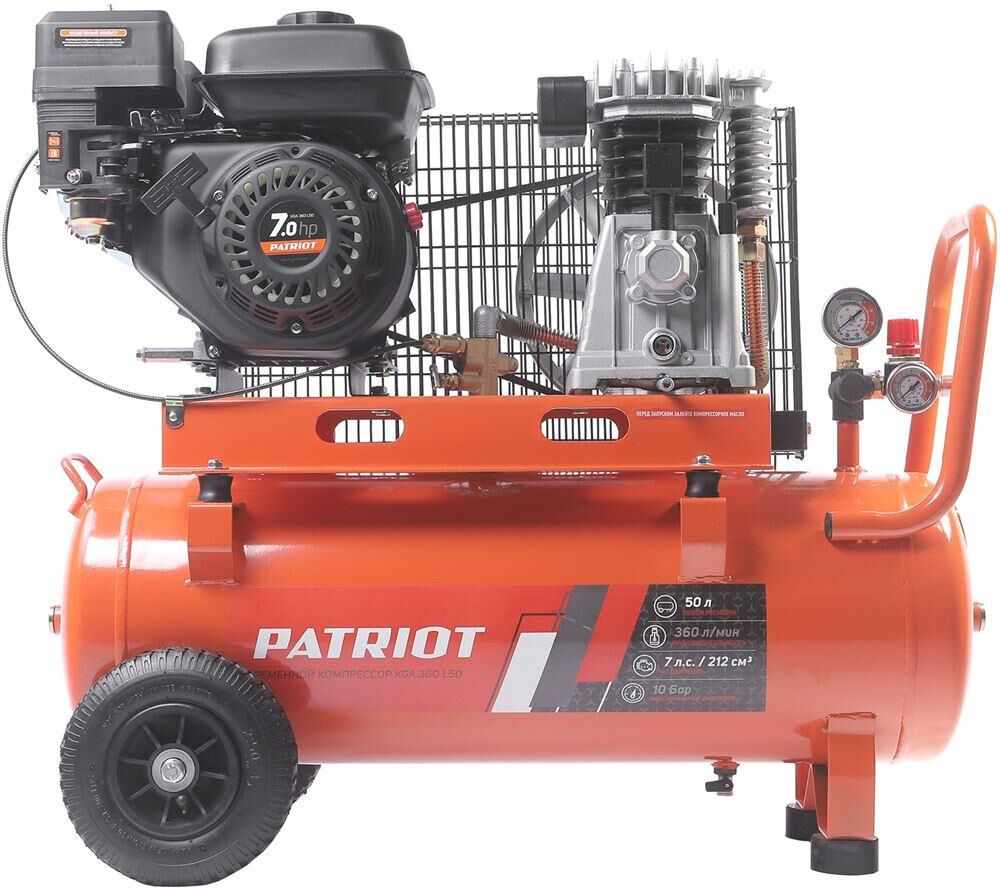 Компрессор воздушный масляный PATRIOT KGA 360 L50 бензиновый поршневой ременной понадобится там, где нет доступа к электросети или мощности сети недостаточно. Эффективен для автономных и мобильных строительных, ремонтных и покрасочных работ с различным пневмоинструментом, подойдет для продувки водопроводов на больших территориях. Обеспечивает стабильную работу в любых условиях. Справится любой пользователь Легкий запуск двигателя. Высокая производительность Объем ресивера 50 литров и производительность 360 л/мин. Долгая автономная работа Высокопроизводительная помпа и эффективная система охлаждения. Для разных задач Работает без доступа к электросети, идеален для мест с ограниченной мощностью. Подходит даже для запуска больших асинхронных двигателей. Экономный расход Система управления ходом двигателя способствует снижению расхода топлива. Низкий уровень шума Не требует дополнительных мер по звукоизоляции. Два разъема Быстросъемный разъем RAPID и шаровый кран с переходником на соединение типа «елочка». Защита