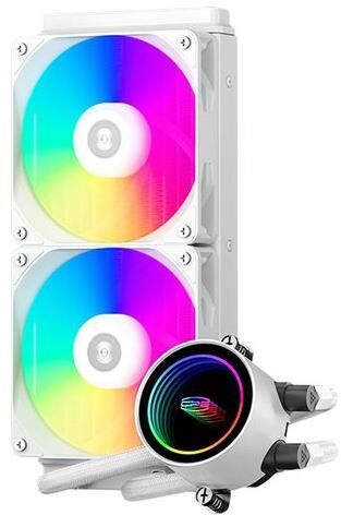 Тип компонента: помпа. Количество вентиляторов: 2. Размер вентилятора: 120. Материал радиатора: алюминий. Тип поставки: Ret. Цвет подсветки: многоцветная. Особенности: жидкостное охлаждение с радиаторным блоком для внутреннего крепления,собрана и заправлена, не требует обслуживания, необходима только установка 3 pin питание подсветки. Макс, рассеиваемая мощность (TDP, Вт): 270. Материал основания прилегающего к охлаждаемому устройству: медь. Питание вентилятора от материнской платы: 4-pin. Питание помпы от материнской платы: 4-pin. Потребляемое напряжение вентилятора: 12. Потребляемая мощность вентилятора: 3.24. Потребляемая мощность помпы: 3.36. Термопаста в комплекте: есть. Габариты упаковки (ед) ДхШхВ: 0.325x0.135x0.2. Вес упаковки (ед): 1.79. Тип подсветки: ARGB. Цвет: белый. Длина радиатора: 277. Толщина радиатора: 27. Ширина радиатора: 120. Гарантия: 36 мес.. Скорость вращения вентилятора: 500 - 1800 об/мин. Скорость вращения помпы: 3000 об/мин. Тип подшипника: Hydro Bearing. Тепловые трубки: без теплов