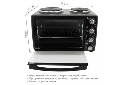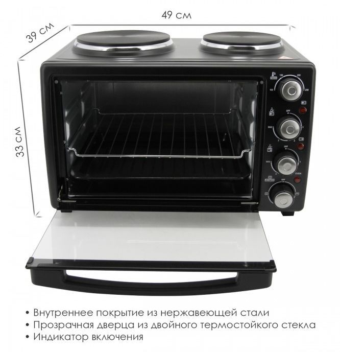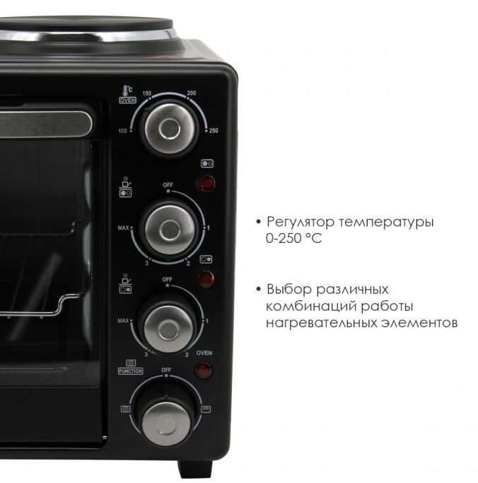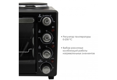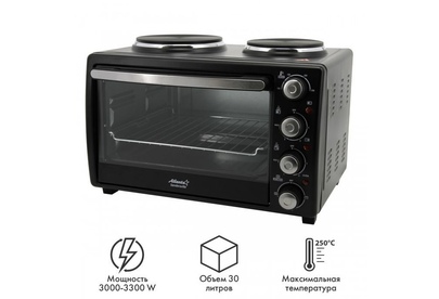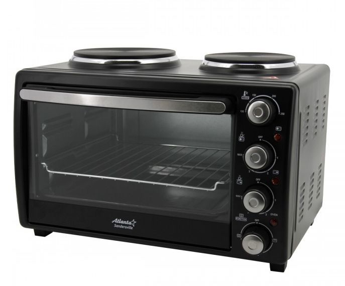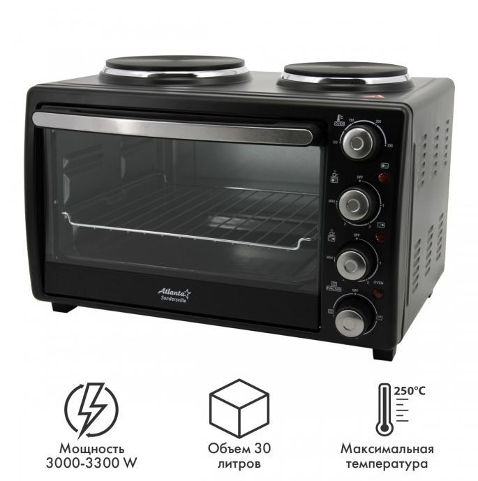 ATLANTA ATH-1410 (BLACK) Объём 30 литров Варочная поверхность Выбор различных комбинаций работы нагревательных элементов Регулятор температуры 0-250 °C Защита от перегрева Световой индикатор работы Кабель питания 80см Номинальная мощность 3200 Вт 230 B ~ 50 Гц