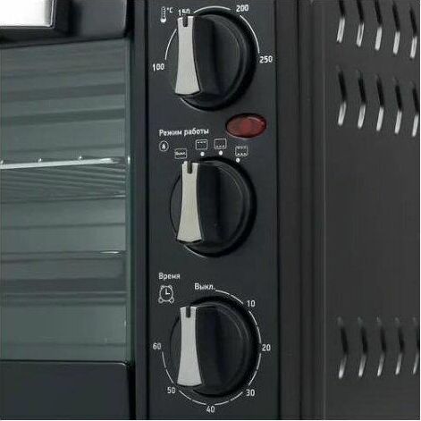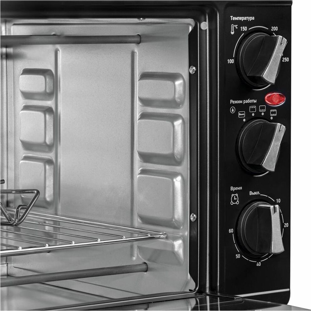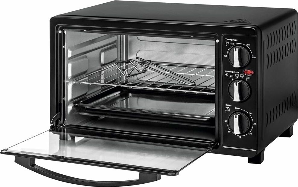 23 л, механическое упр., 1500 Вт, таймер 60 минут со звуковым сигналом, регулировка температуры 100-250 С, функции: гриль, жарка, запекание, эмалированный противень, решетка и ручка для противня в комплекте