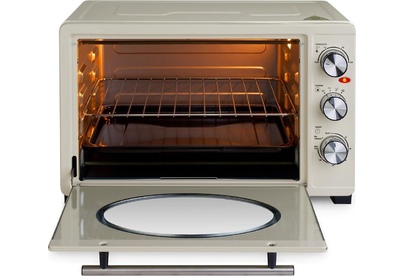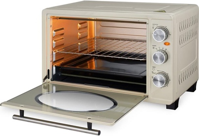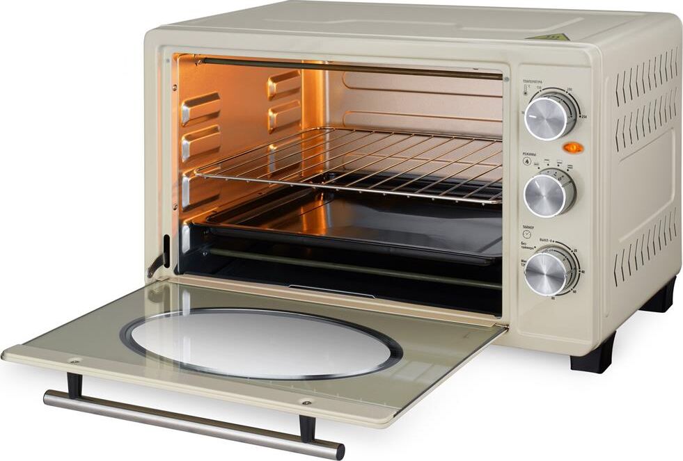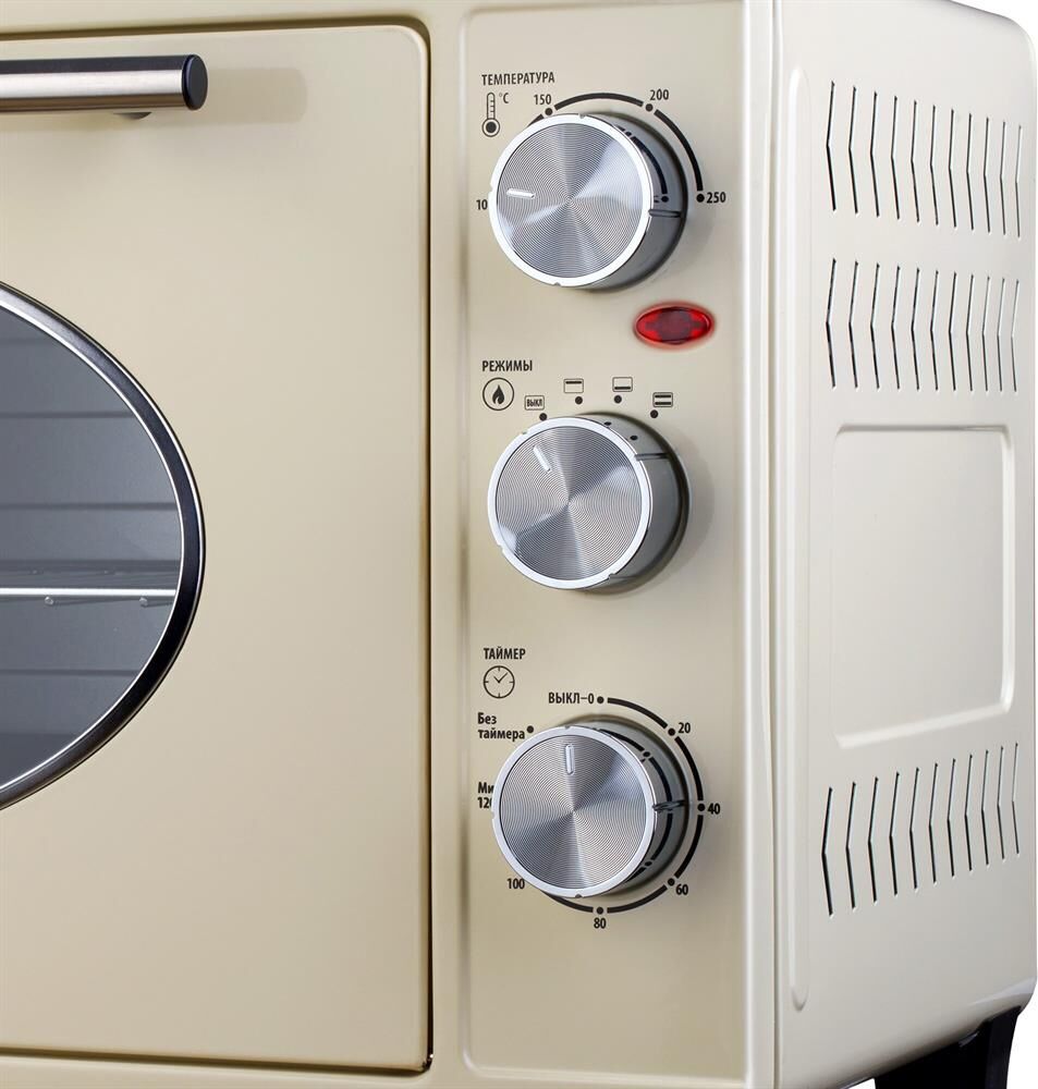 Объем 33 л; Мощность 1500 Вт; 220-240 В; Механический тип управления; Регулировка температуры до 250°С; Ручка из нержавеющей стали; Таймер; световой индикатор; Внутренняя подсветка; 3 режима работы; Плавная регулировка мощности; Цвет: бежевый/хром Комплектация: съемная ручка для поддона, съемная решетка, противень эмалированный прямоугольный